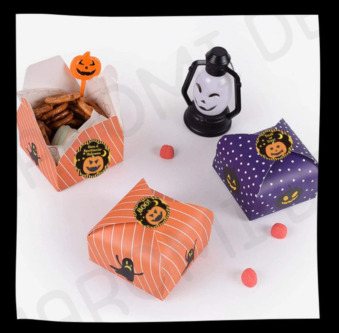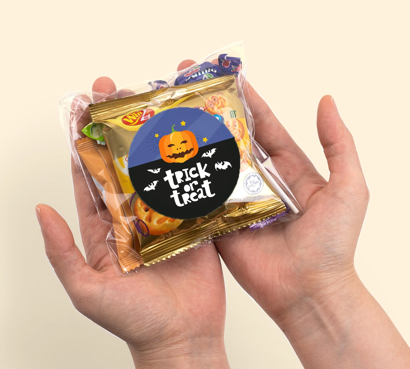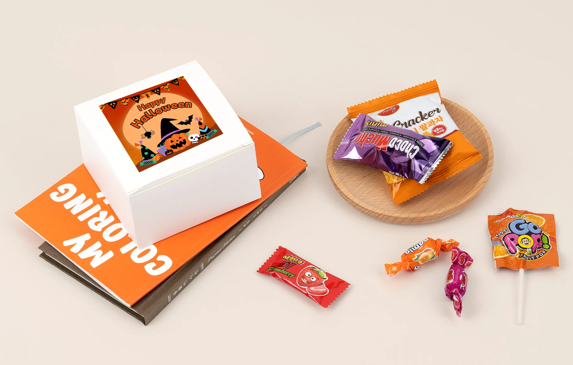 할로윈 포장용 스티커가 구매자가 직접 간식 등에 부착할 수 있도록 구성된 상품이었다면, 할로윈 간식꾸러미는 구매자가 일일히 간식을 구매하고 포장할 필요 없이 스티커가 붙여진 간식 세트를 구매할 수 있도록 구성되었습니다.