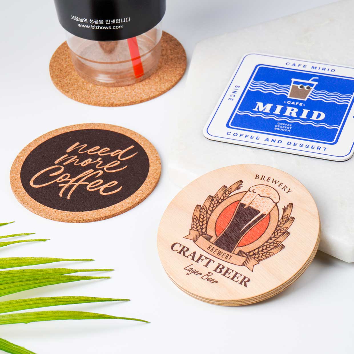 매장 브랜딩, 홈카페, 기념품 등으로 활용 가능한 인쇄 코스터입니다.