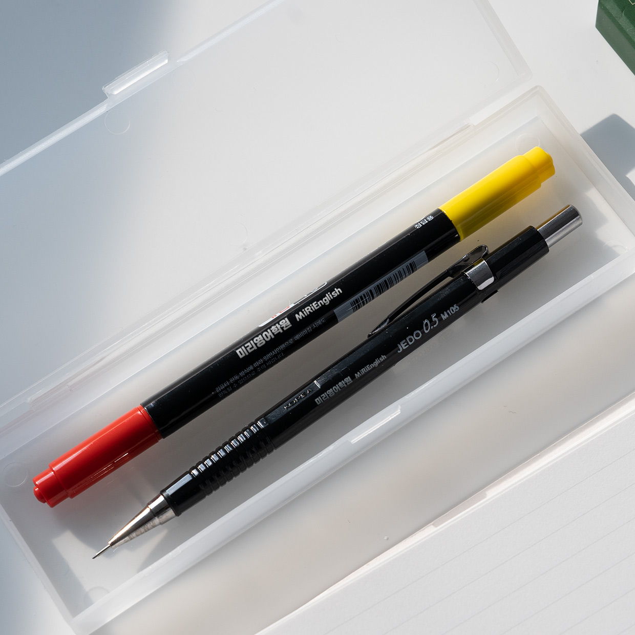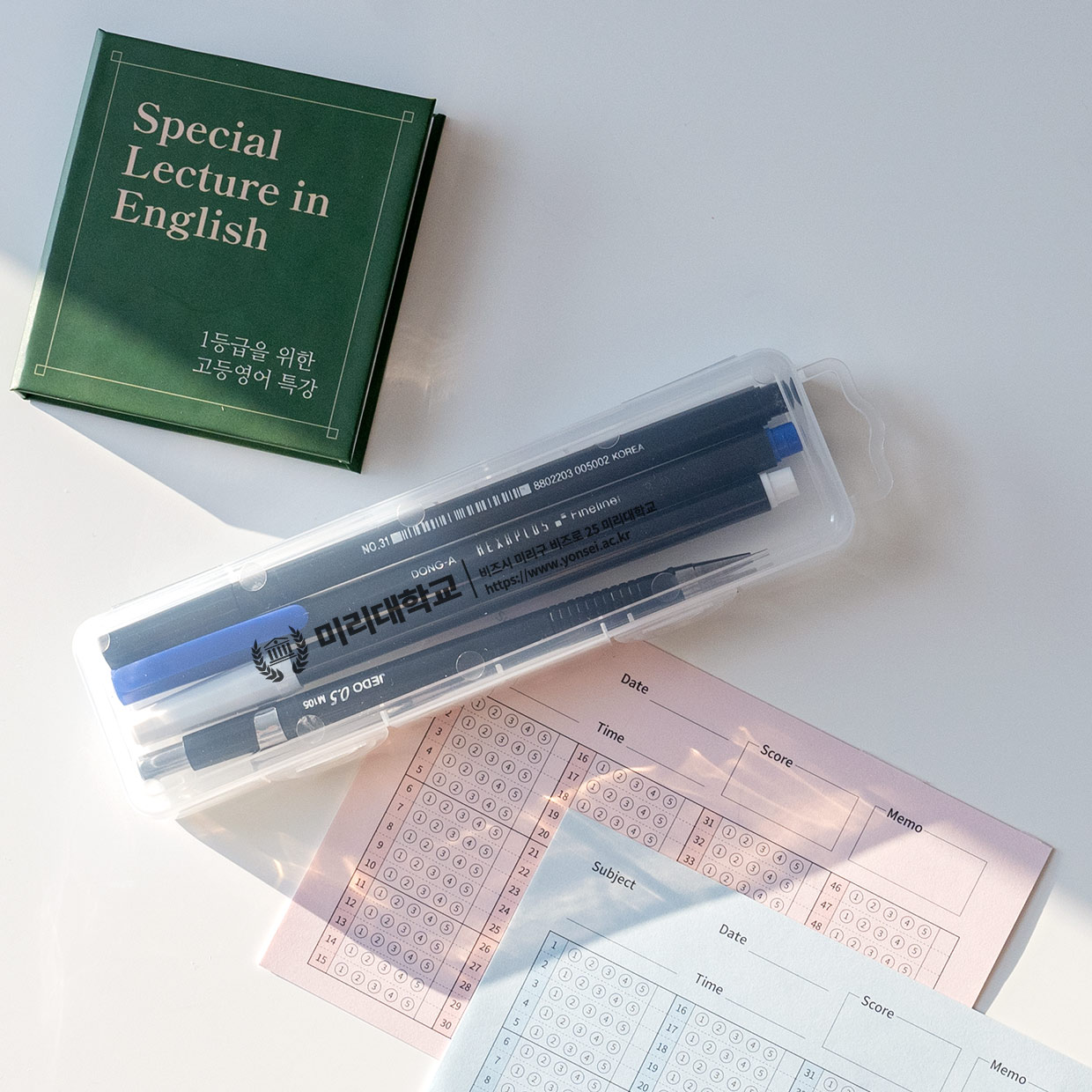 여러 가지 문구를 플라스틱 필통에 담은 것이 한 세트로, 디자인은 플라스틱 필통에 프린트됩니다.
