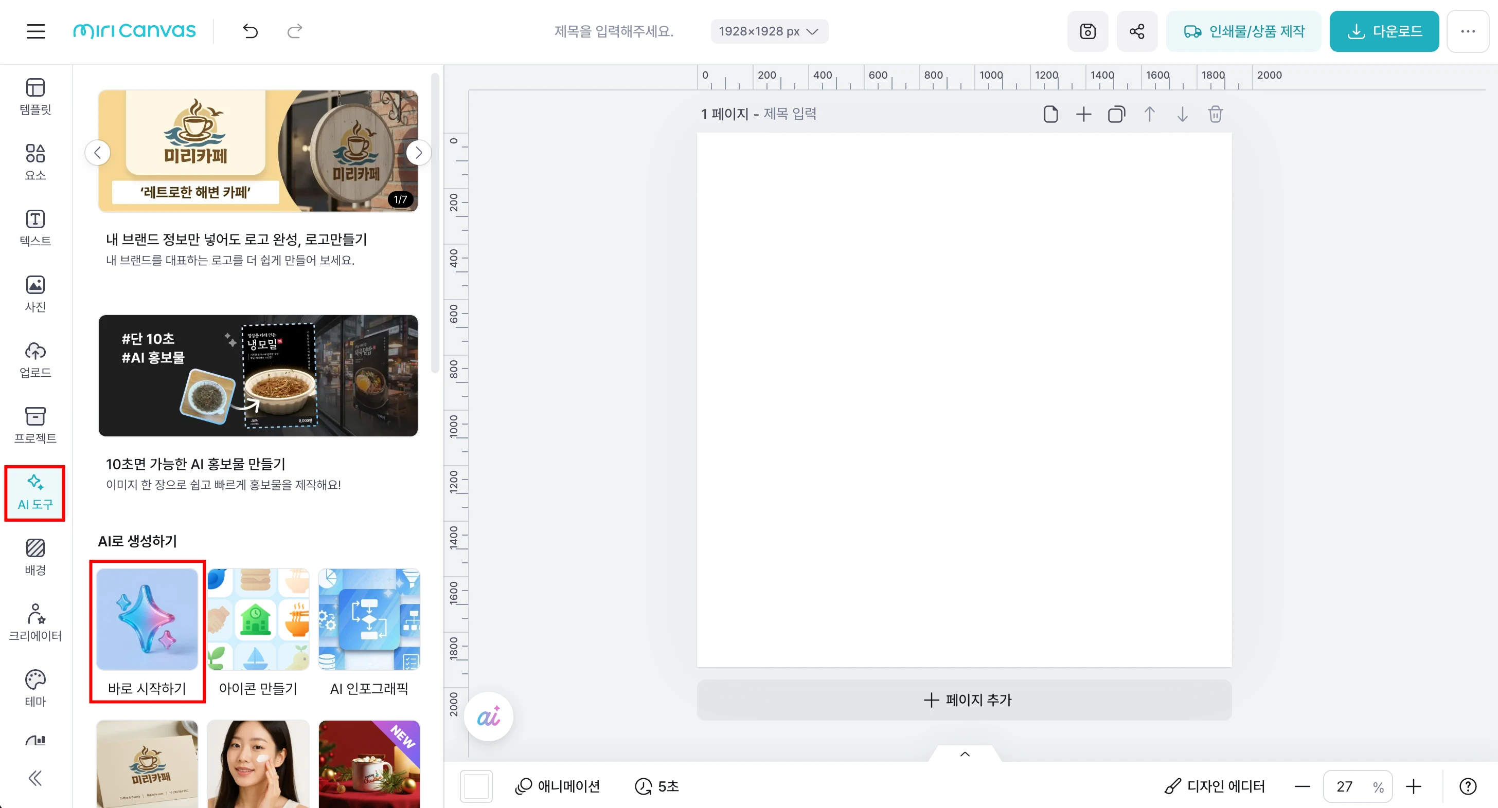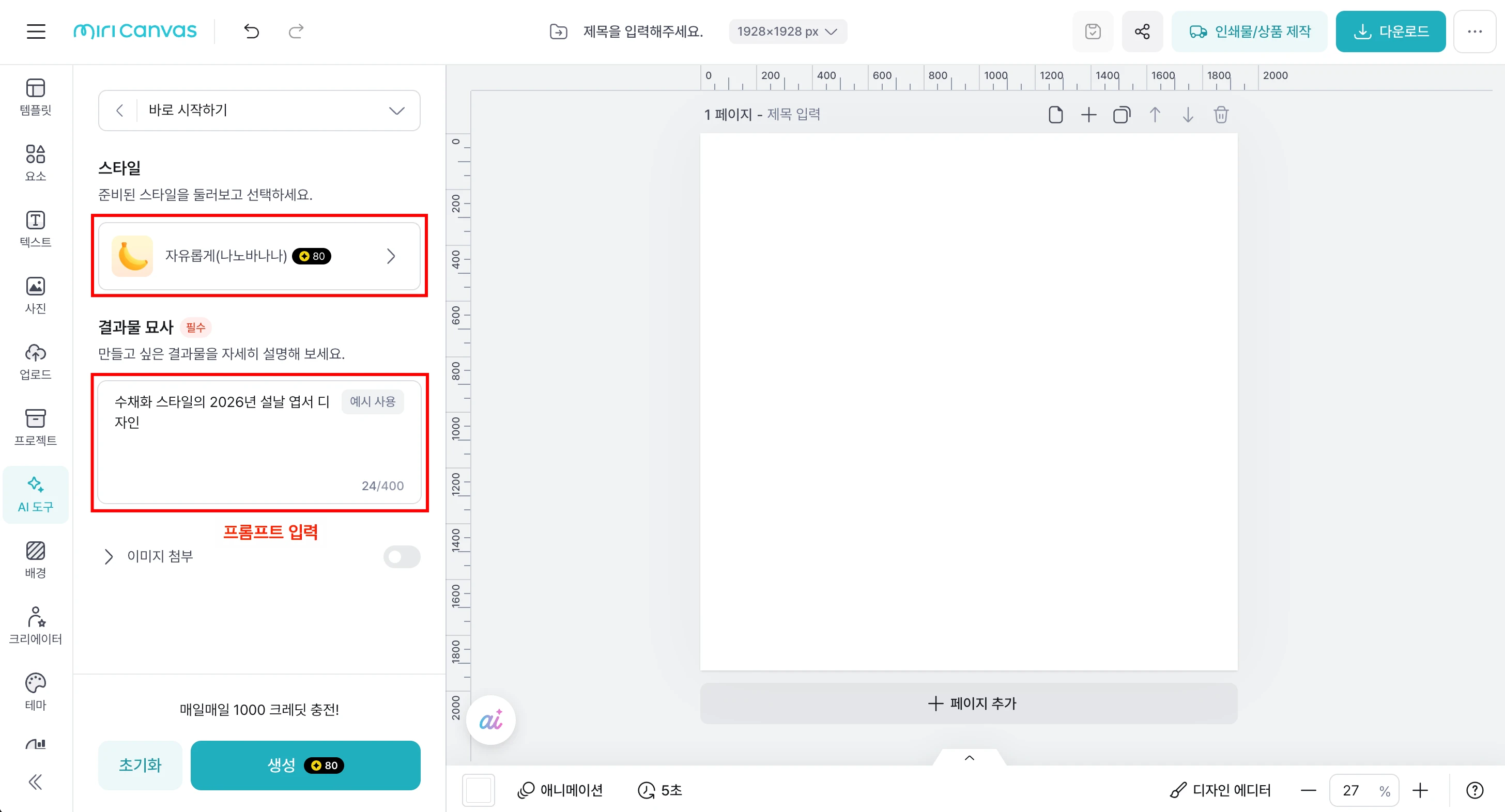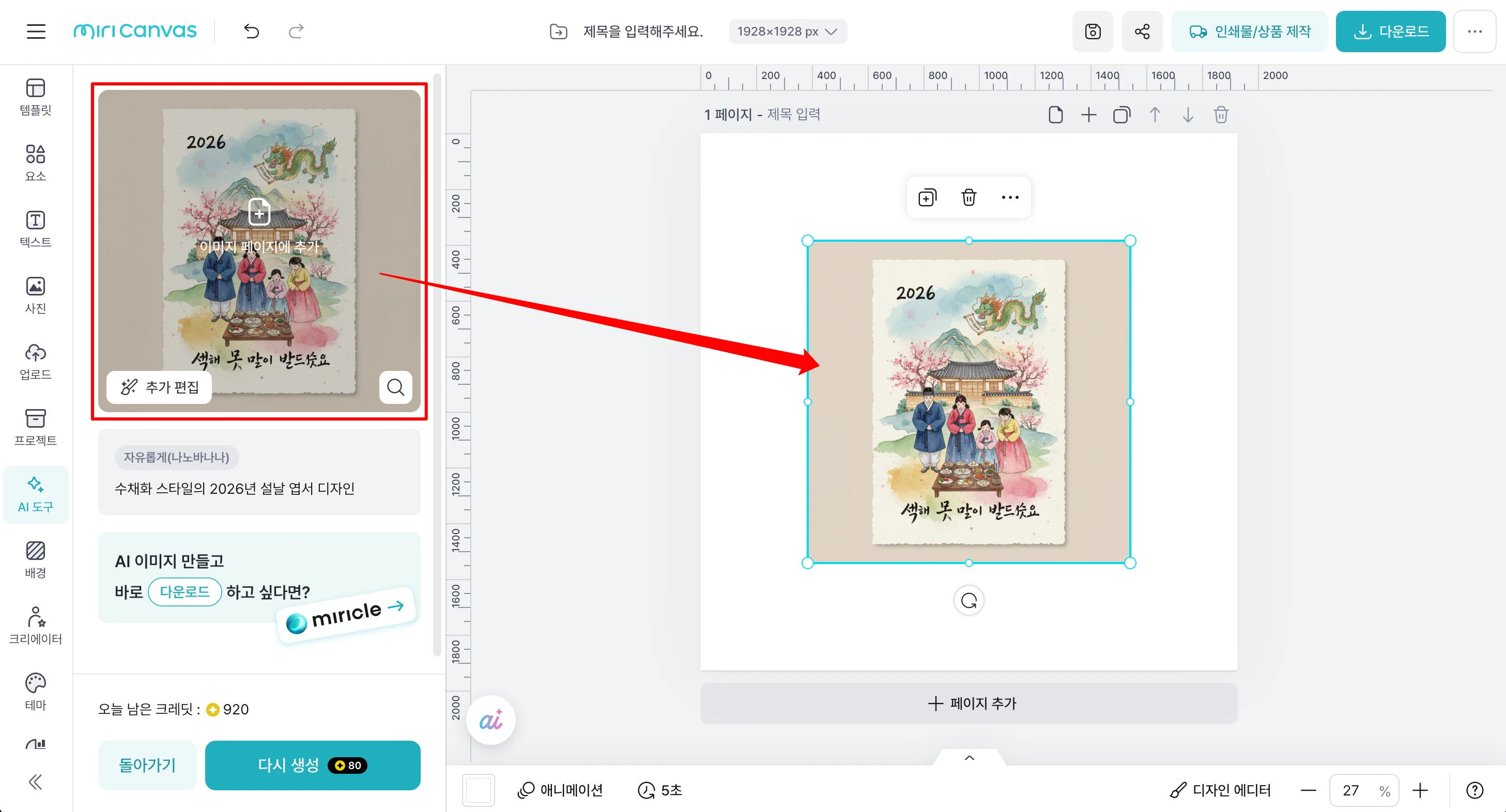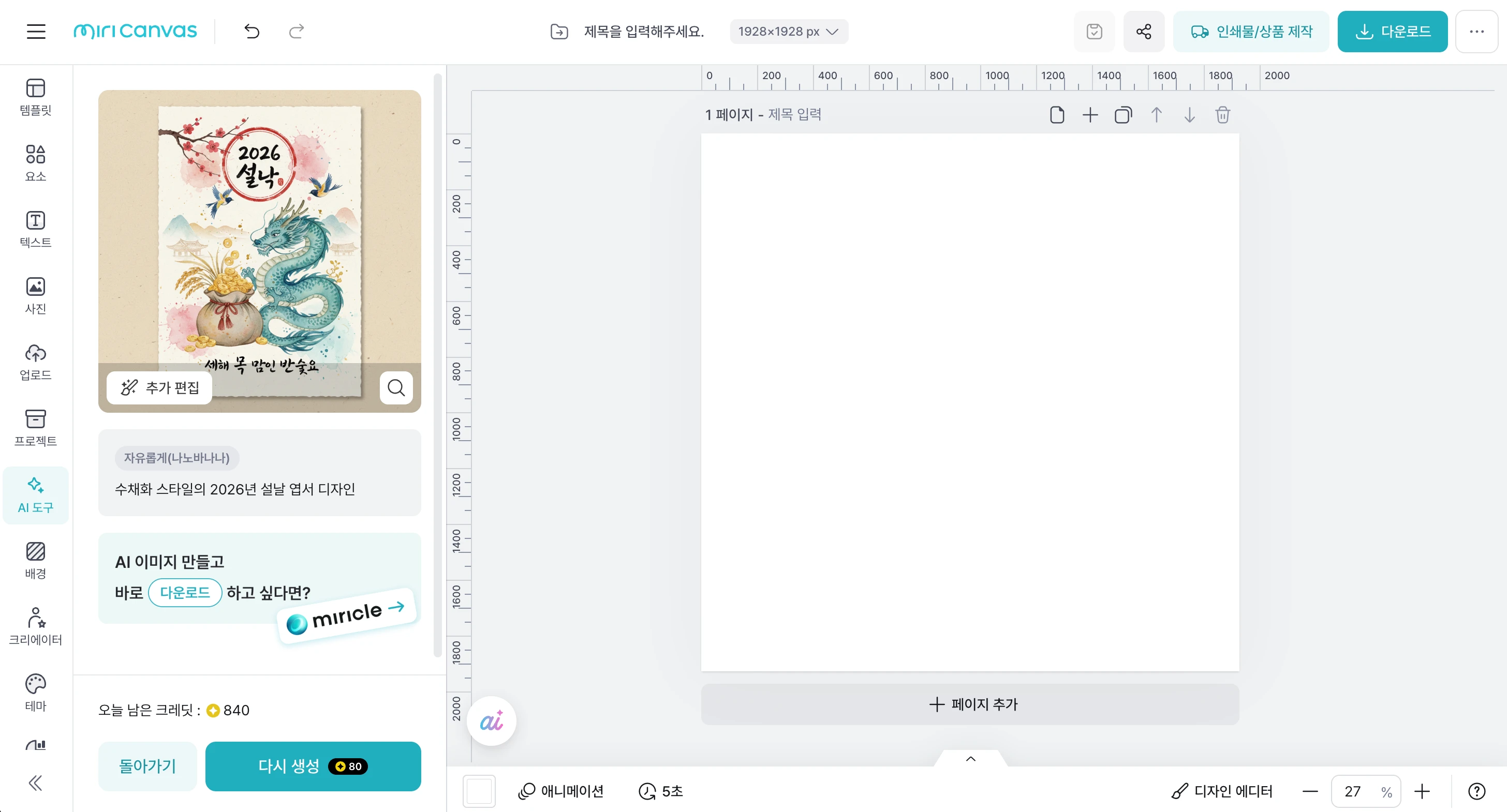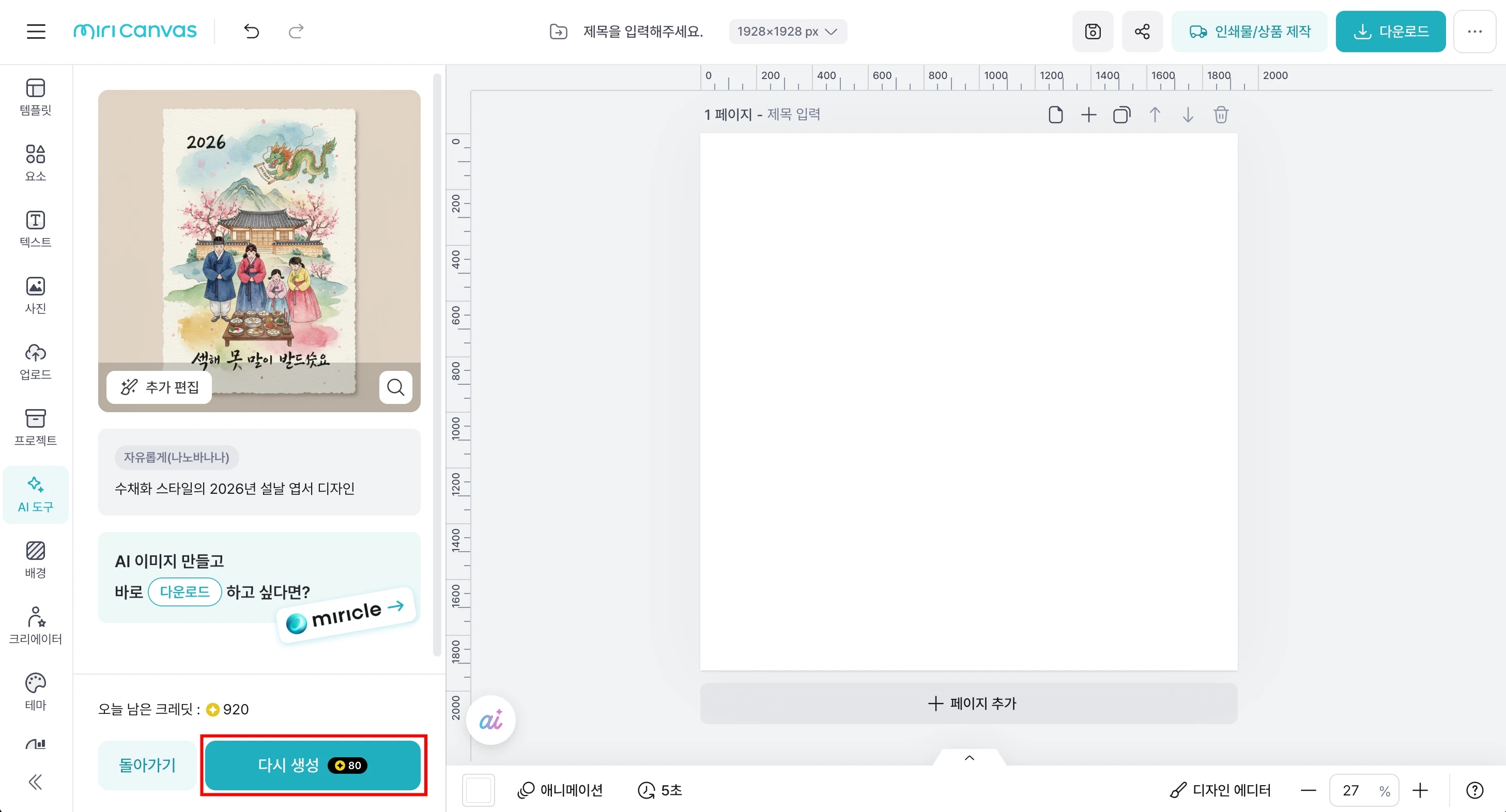 템플릿 디자인에 어려움을 겪는 기여자님에게 좋은 도구가 될 미리클의 사용 방법을 소개합니다! 미리클은 미리캔버스에서 자체 제작한 생성형 AI 도구로, 디자인 작업에 유용하게 활용할 수 있습니다. 완성도 높은 템플릿의 핵심은 정돈된 레이아웃과 통일감 있는 디자인 스타일입니다. 미리클을 활용하면 이러한 요소들을 갖춘 디자인 레퍼런스를 손쉽게 만들어볼 수 있어요. 생성된 레퍼런스를 바탕으로 템플릿을 구성하면, 자연스럽게 완성도가 높아지고 작업 과정도 훨씬 수월해집니다! 1. 미리캔버스 에디터에서 미리클(miricle)을 사용할 수 있어요 에디터 좌측 메뉴의 'AI 도구' 탭에서 미리클을 사용할 수 있습니다. 원하는 이미지를 바로 생성하여 에디터에 불러올 수 있어 더욱 편리해요. 1️⃣ 왼쪽 메뉴 바 > AI 도구 > 바로 시작하기 2️⃣ '자유롭게(나노바나나)' 선택 3️⃣ 생성된 이미지 확인 4️⃣ 마음에 드는 이미지는 바로 에디터에 불러오기 5️⃣ 마음에 들지 않는다면 '다시 생성' 6️⃣ 원하는 이미지가 나올 때까지 반복 ※ 미리클 1회 사용에는 80크레딧이 소모됩니다. 미리캔버스 Pro 유저는 하루 1000 크레딧을, 무료 유저는 하루 200 크레딧을 사용할 수 있어요.