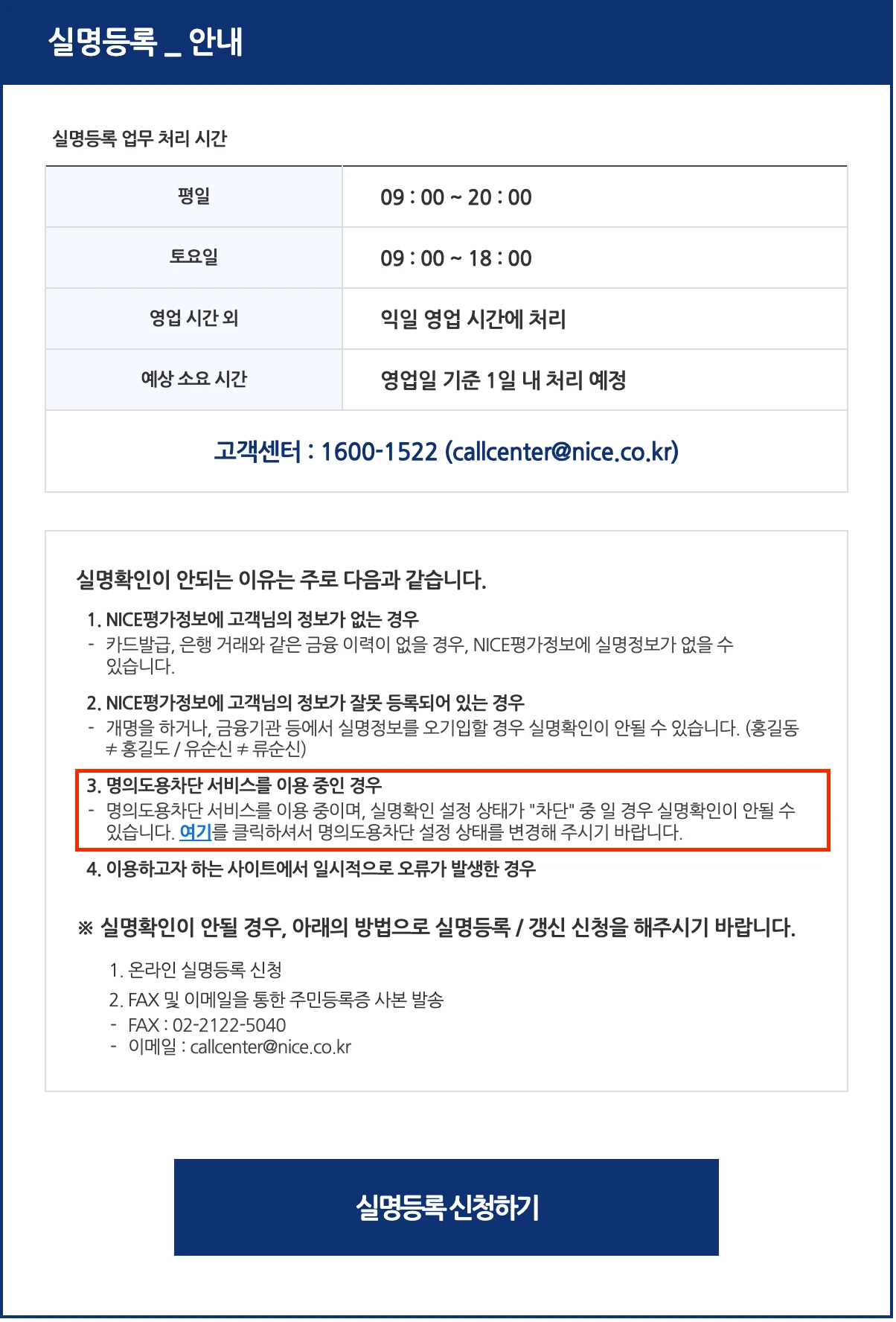개명을 하거나, 금융기관 등에서 실명정보를 오기입할 경우 실명확인이 안될 수 있습니다. (홍길동 ≠ 홍길도 / 유순신 ≠ 류순신)