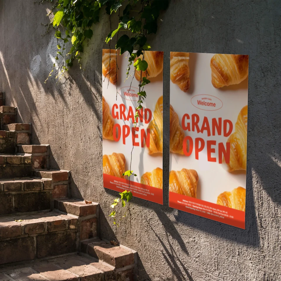 매장 외부에 가게 오픈 소식을 알릴 수 있는 홍보물로, 매장 외부에 부착하거나 출입구에 비치하여 고객의 시선을 끌 수 있습니다. ‘GRAND OPEN’, ‘오늘 새로 문을 열었습니다’ 등의 문구를 활용해 보세요.