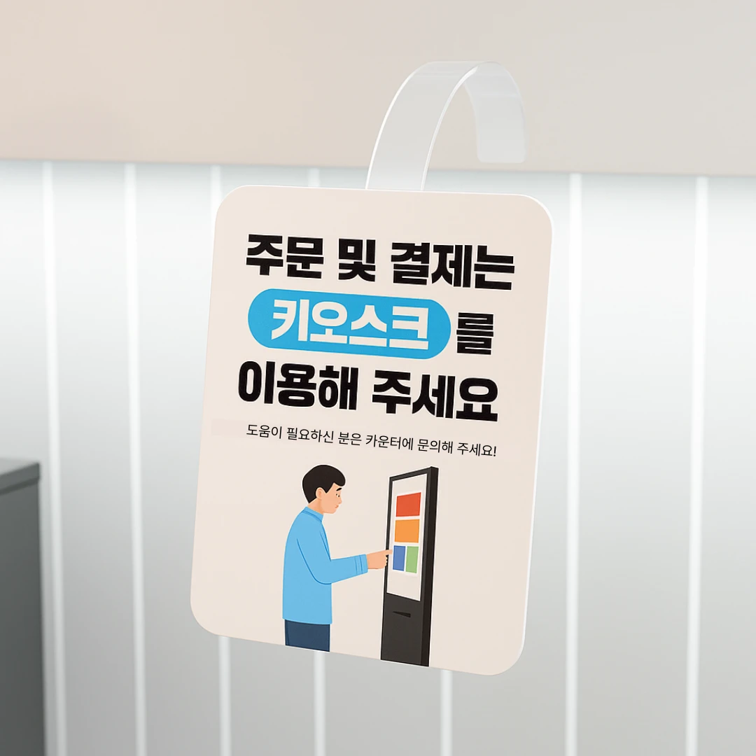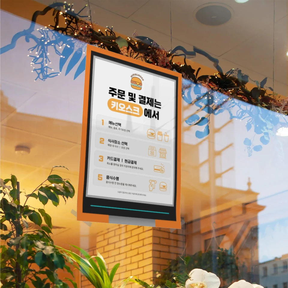 출입구, 계산대, 키오스크 상단 등 눈에 띄는 위치에 설치하면 효과적입니다.