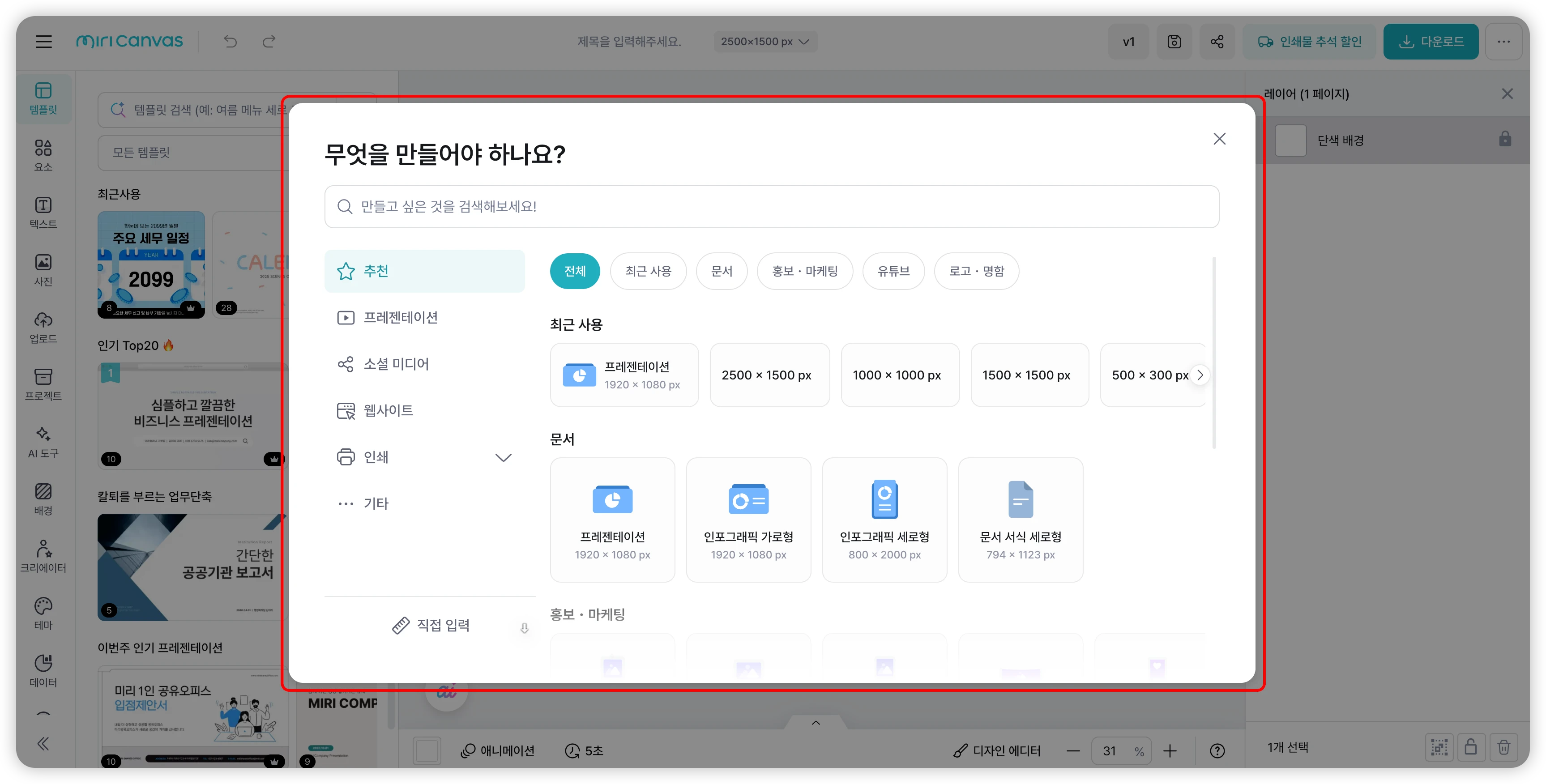미리캔버스 워크스페이스에서 '새 디자인 만들기'를 클릭하면, 아래와 같은 팝업이 나타납니다.