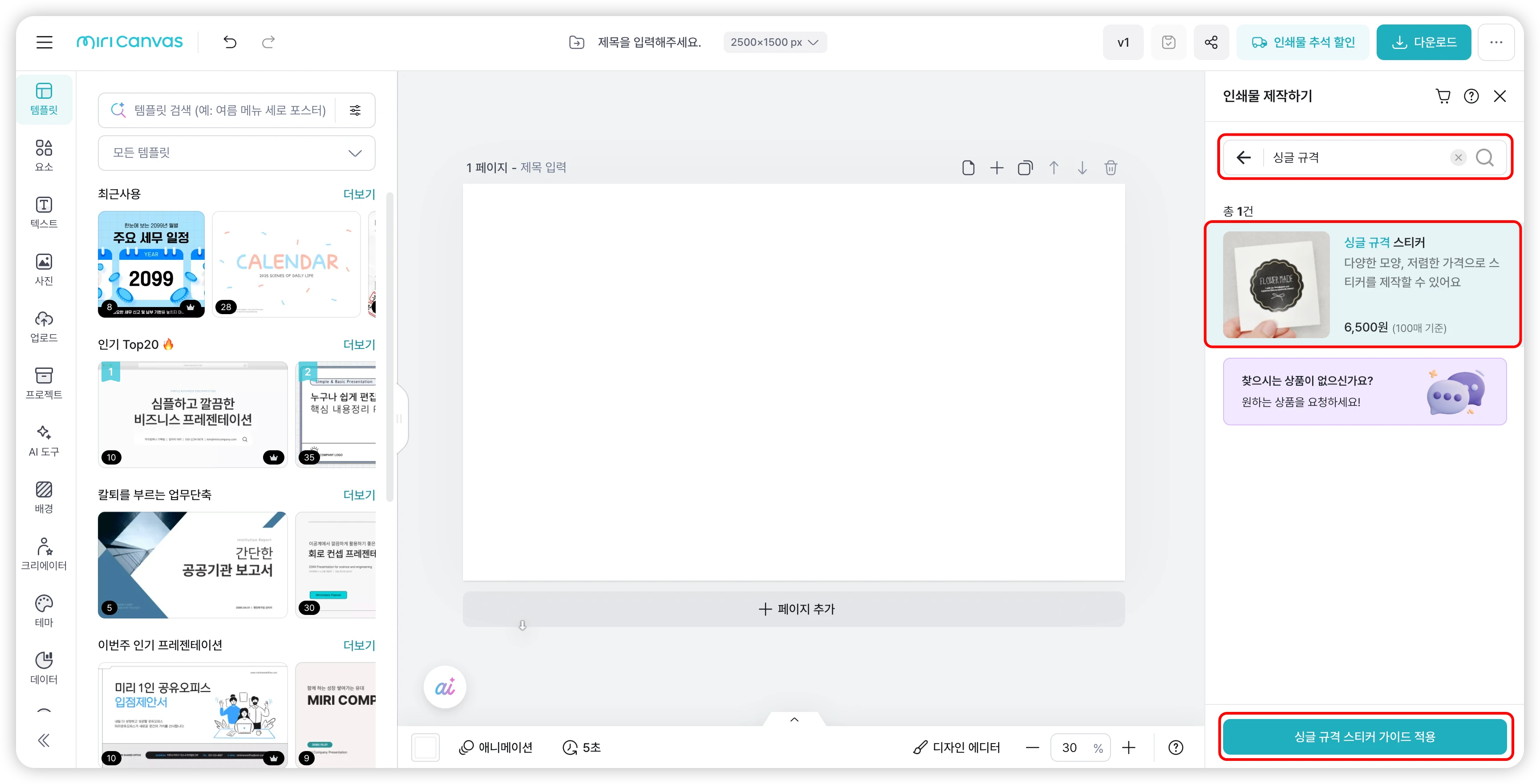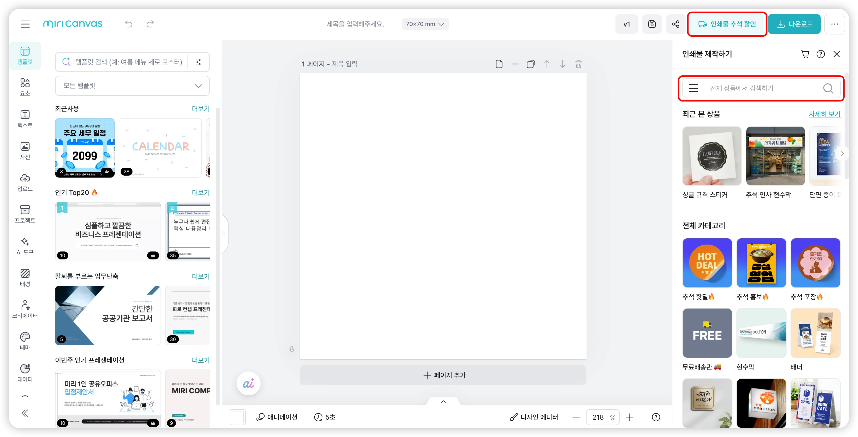 우측 상단의 '인쇄물 제작하기' (현재는 추석 시즌을 맞아 '인쇄물 추석 할인' 으로 변경됨)를 클릭하면, 오른쪽에 인쇄물 제작 패널이 나타납니다.
