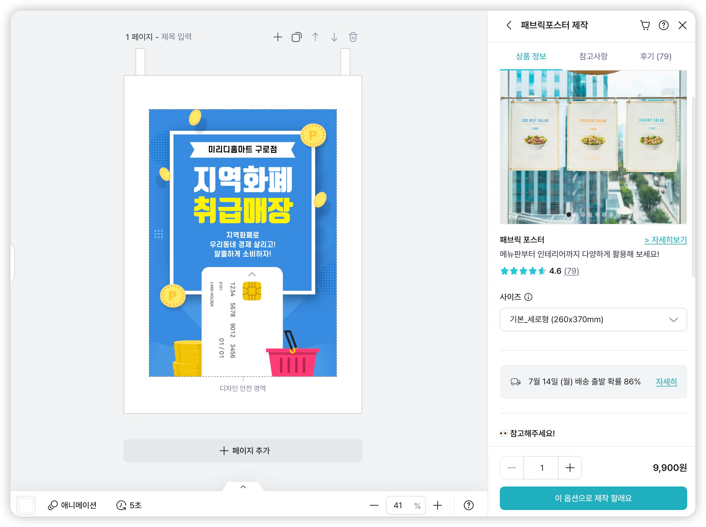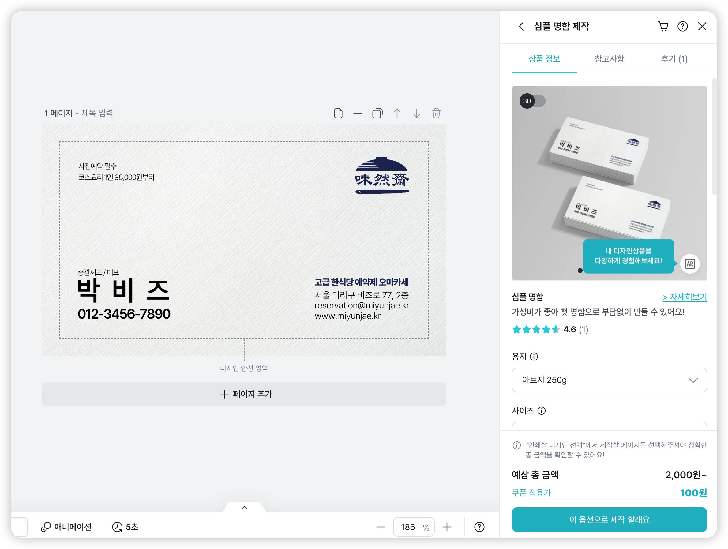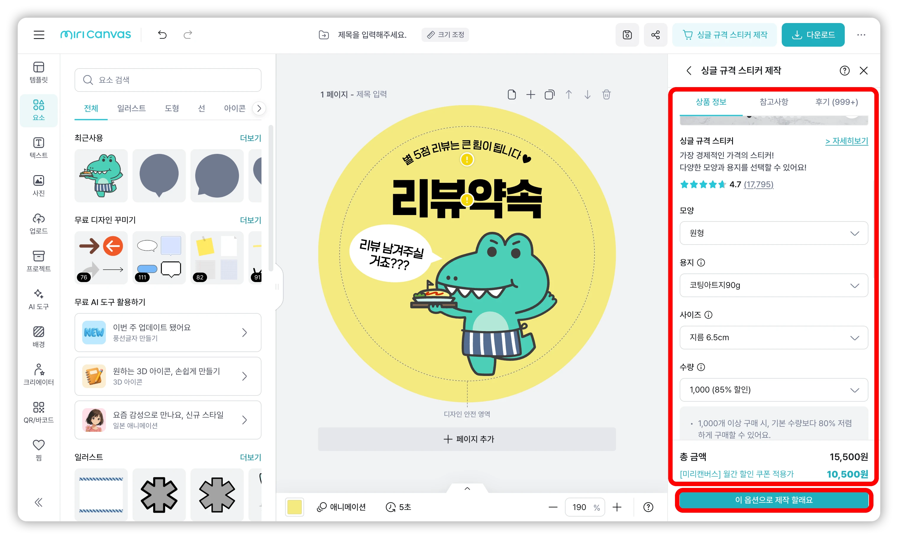 디자인을 마친 후, 우측 패널에서 상품의 수량, 가격, 옵션 등을 설정할 수 있습니다.