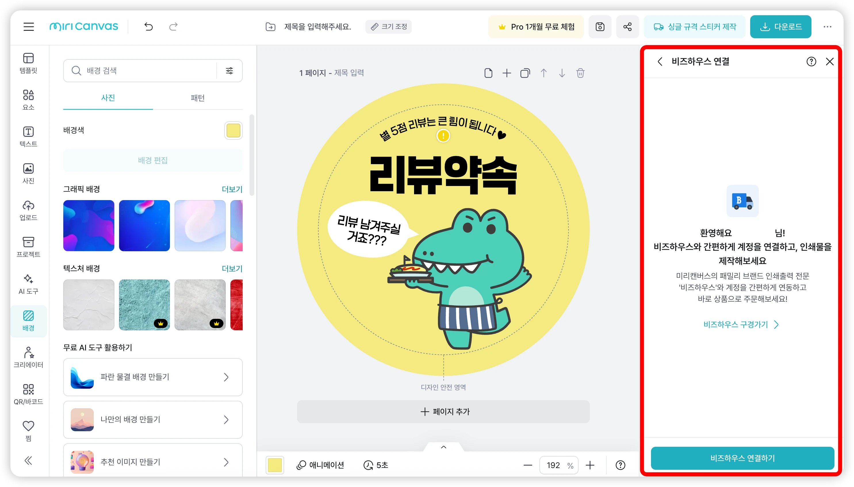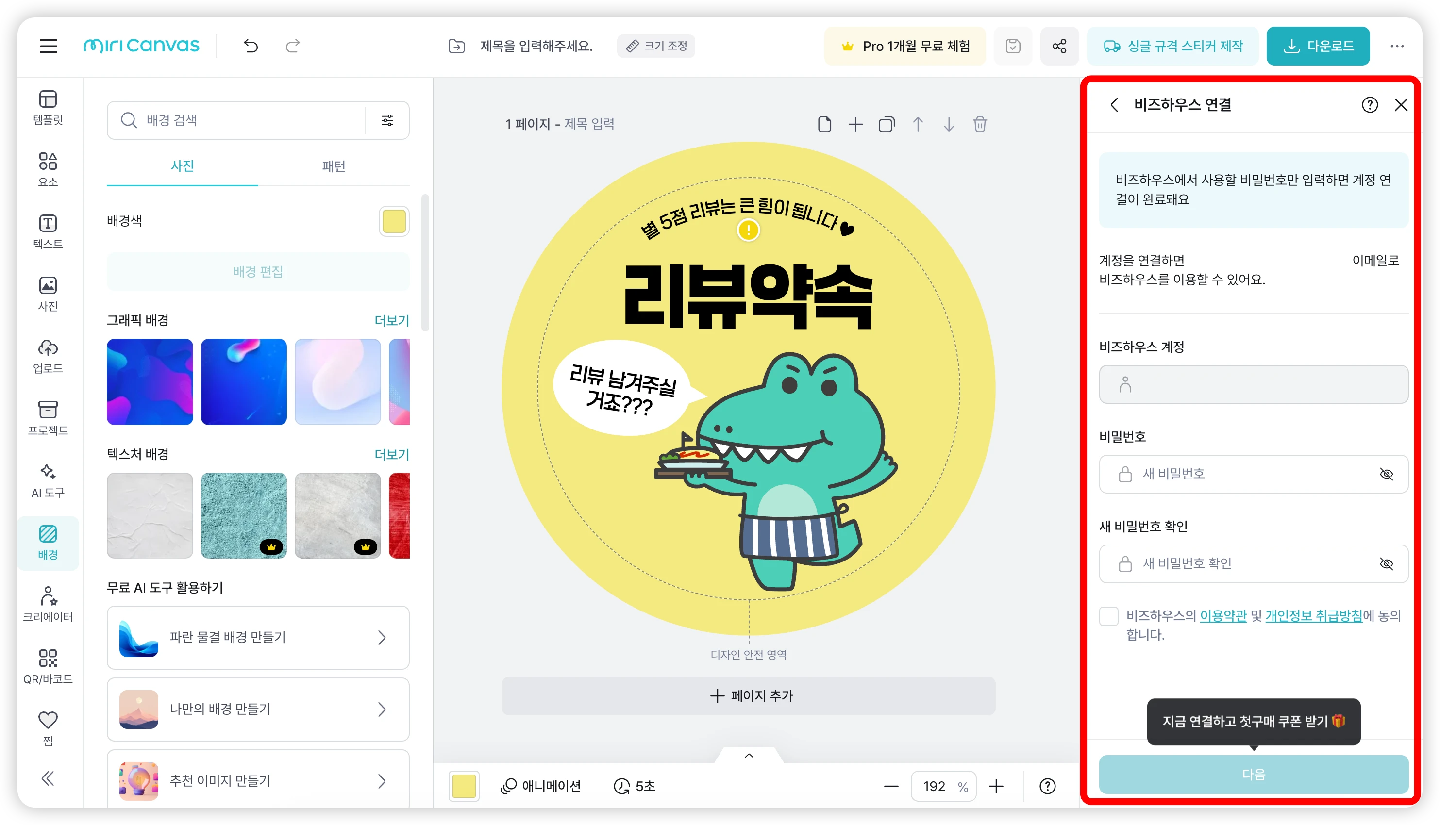 '비즈하우스 연결하기' 버튼을 클릭해 미리캔버스와 비즈하우스 계정을 연동한 후, 저장 버튼을 눌러주세요.