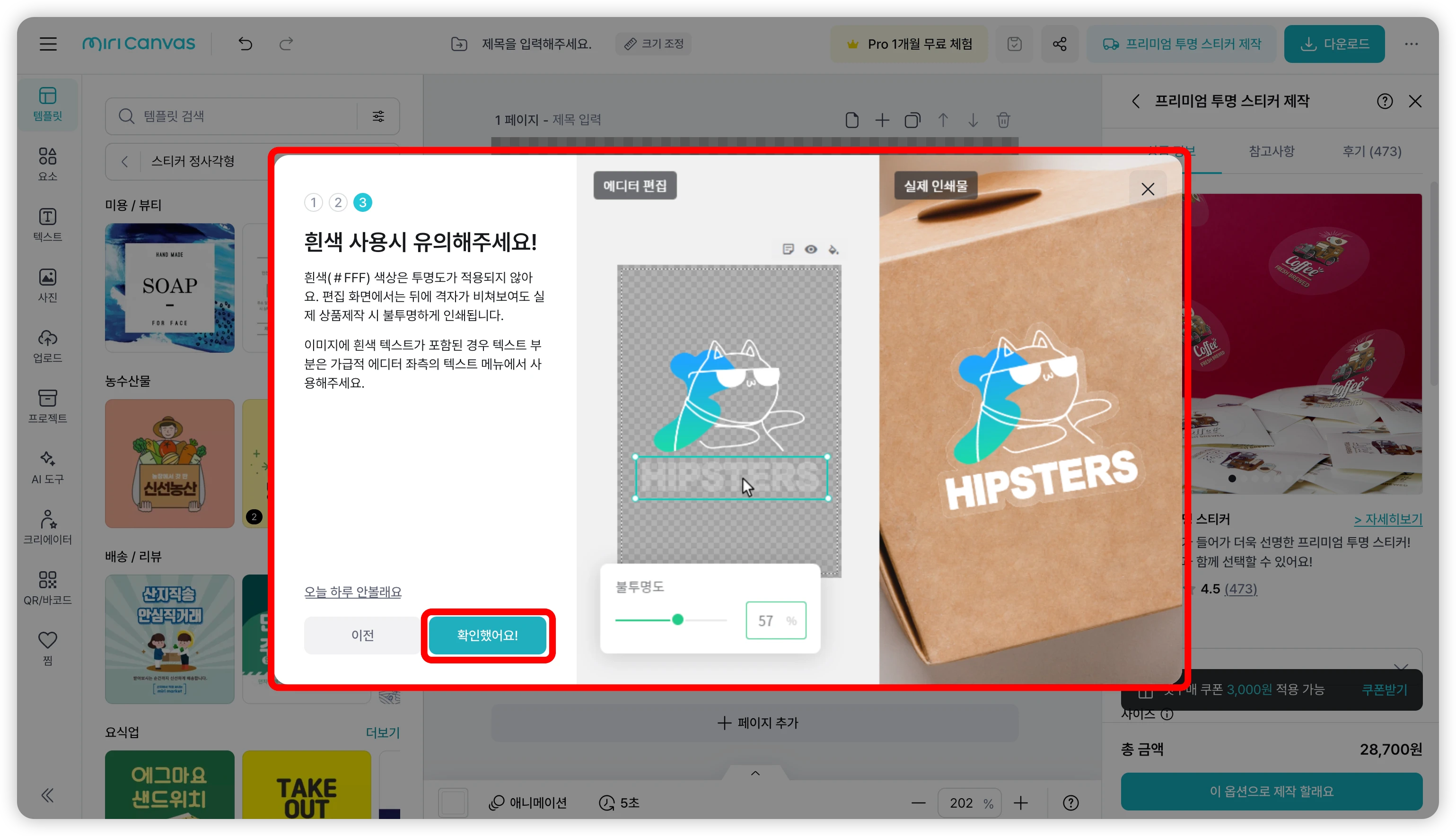 가이드 적용 시 표시되는 팝업에는 상품별로 유의해야 할 디자인 기준이 안내되어 있습니다.