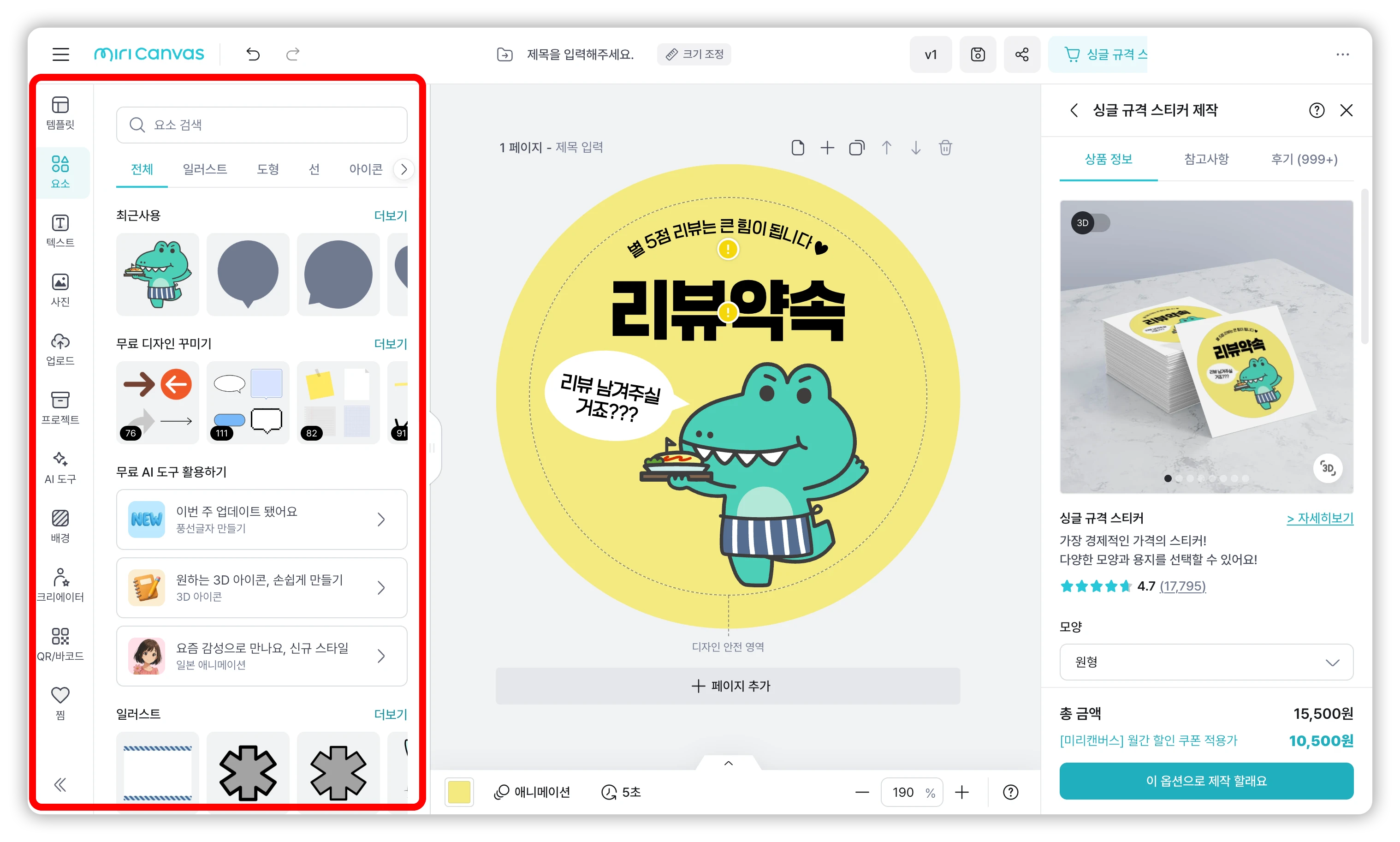 샵 상품 제작 시, 요소와 폰트를 비롯해 미리캔버스에서 제공되는