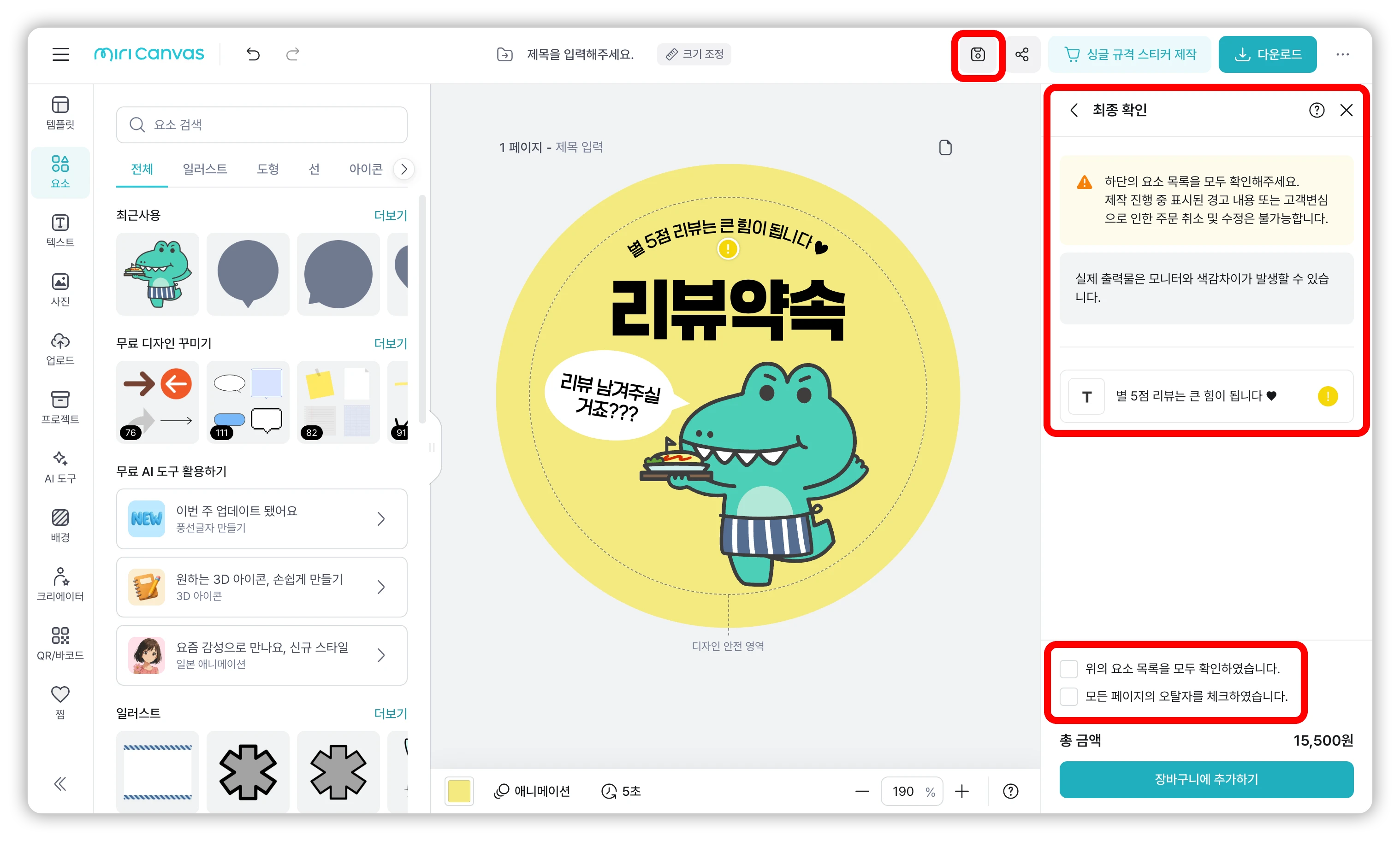 디자인에 문제가 있을 경우(해상도 오류, 안전 영역 이탈 등), 우측 패널에 자동으로 경고 표시가 나타납니다.