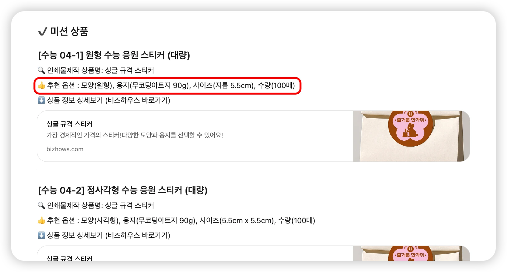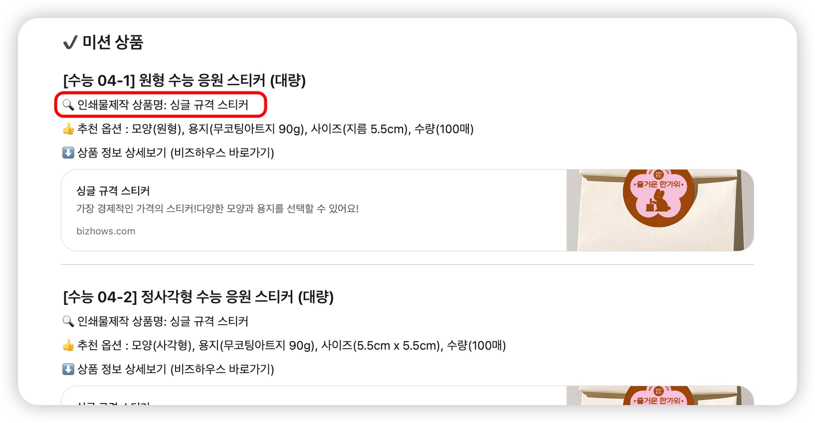 상품을 클릭한 뒤, '싱글 규격 스티커 가이드 적용'을 눌러 엽서 카드의 인쇄물 제작 가이드를 적용해 주세요.