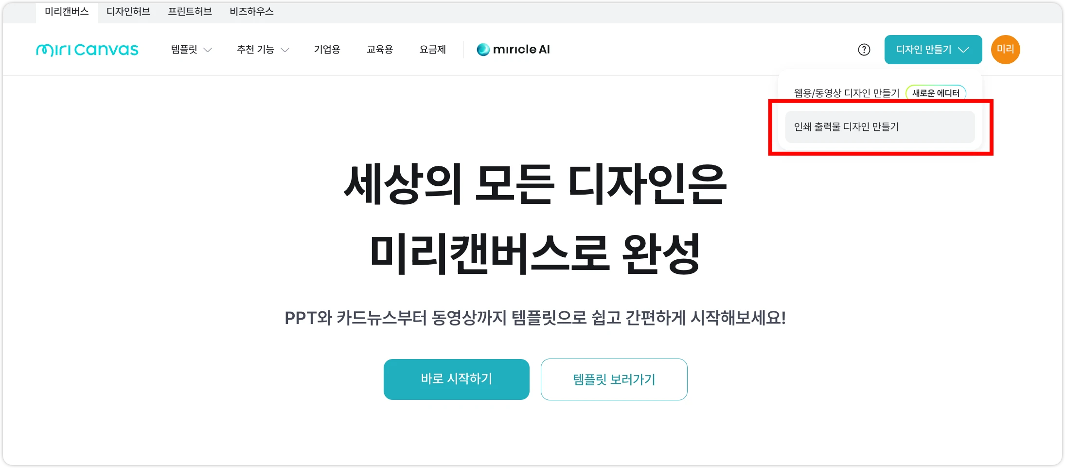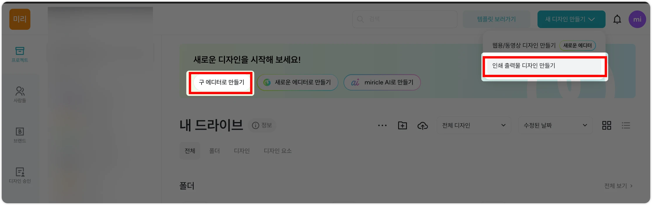 Tip💡 화면을 참고하여, 디자인 시작 전에 <인쇄 출력물 에디터>를 제대로 선택했는지 더블체크하세요