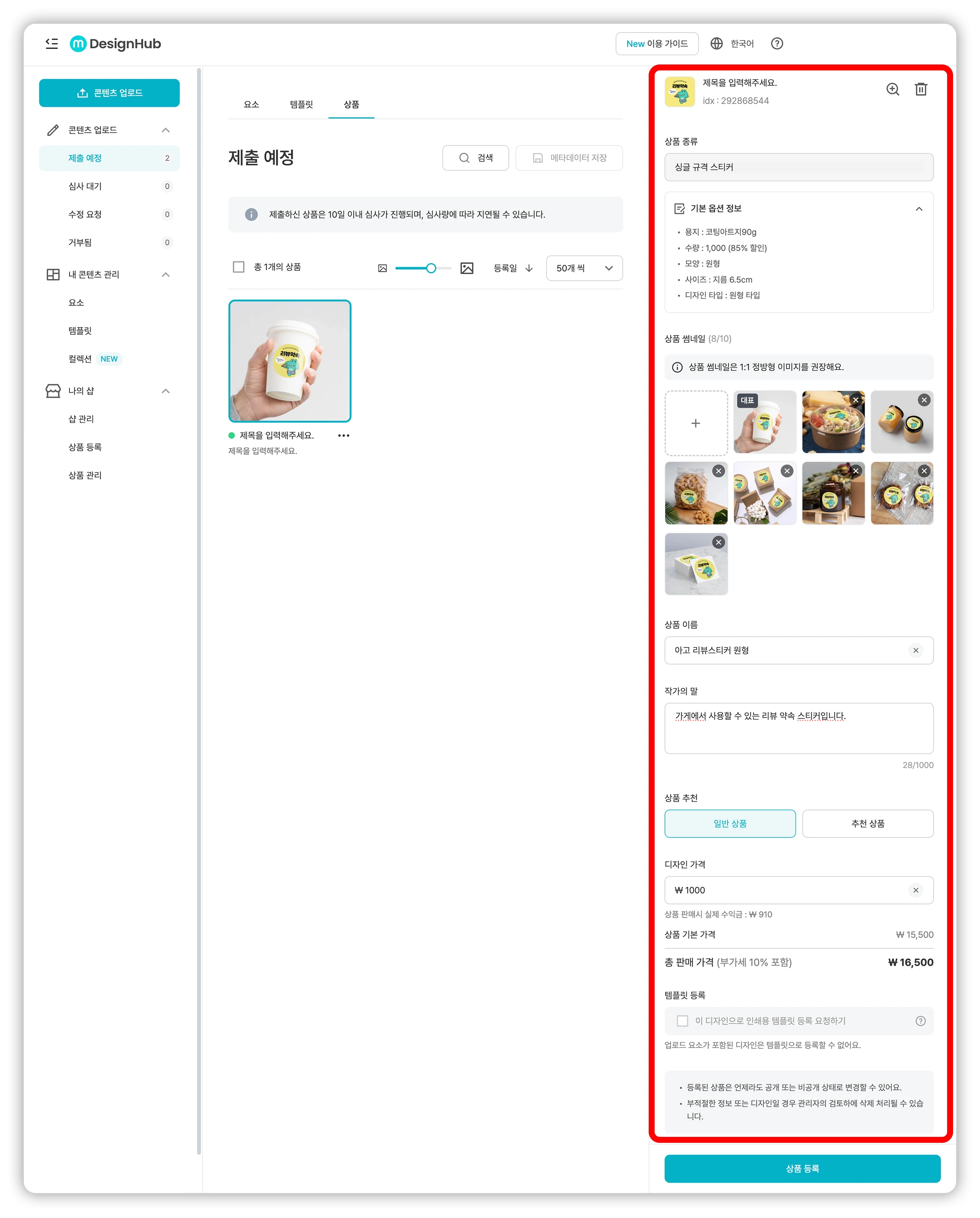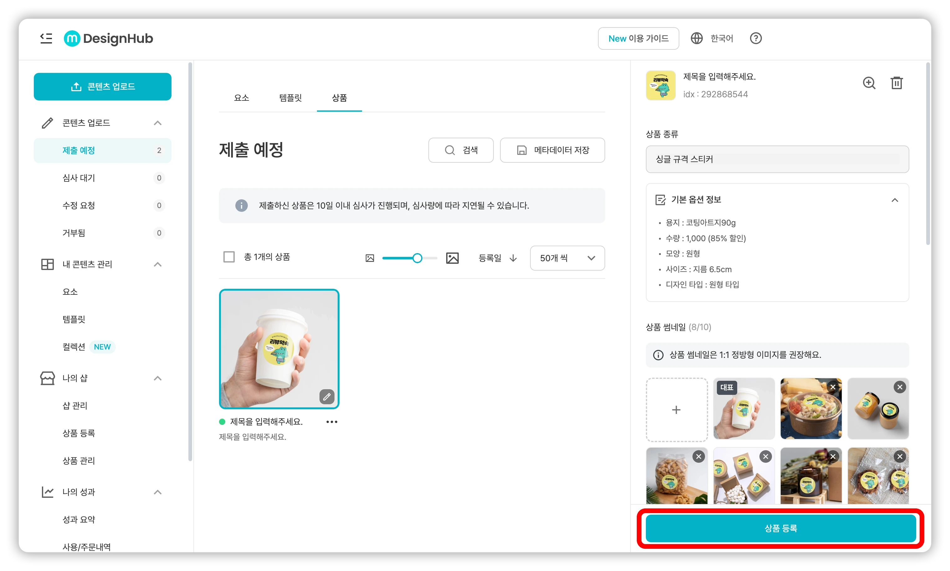 | 드래그하여 순서를 변경하거나 대표 썸네일 이미지를 지정할 수 있습니다. 샵 목록이나 상세 페이지에서 가장 먼저 보이는 정보이므로, 상품의 용도와 디자인이 잘 드러나는 이미지를 선택하는 것이 좋습니다. Tip💡 썸네일은 어떤 사진으로 설정하는 것이 좋나요? |