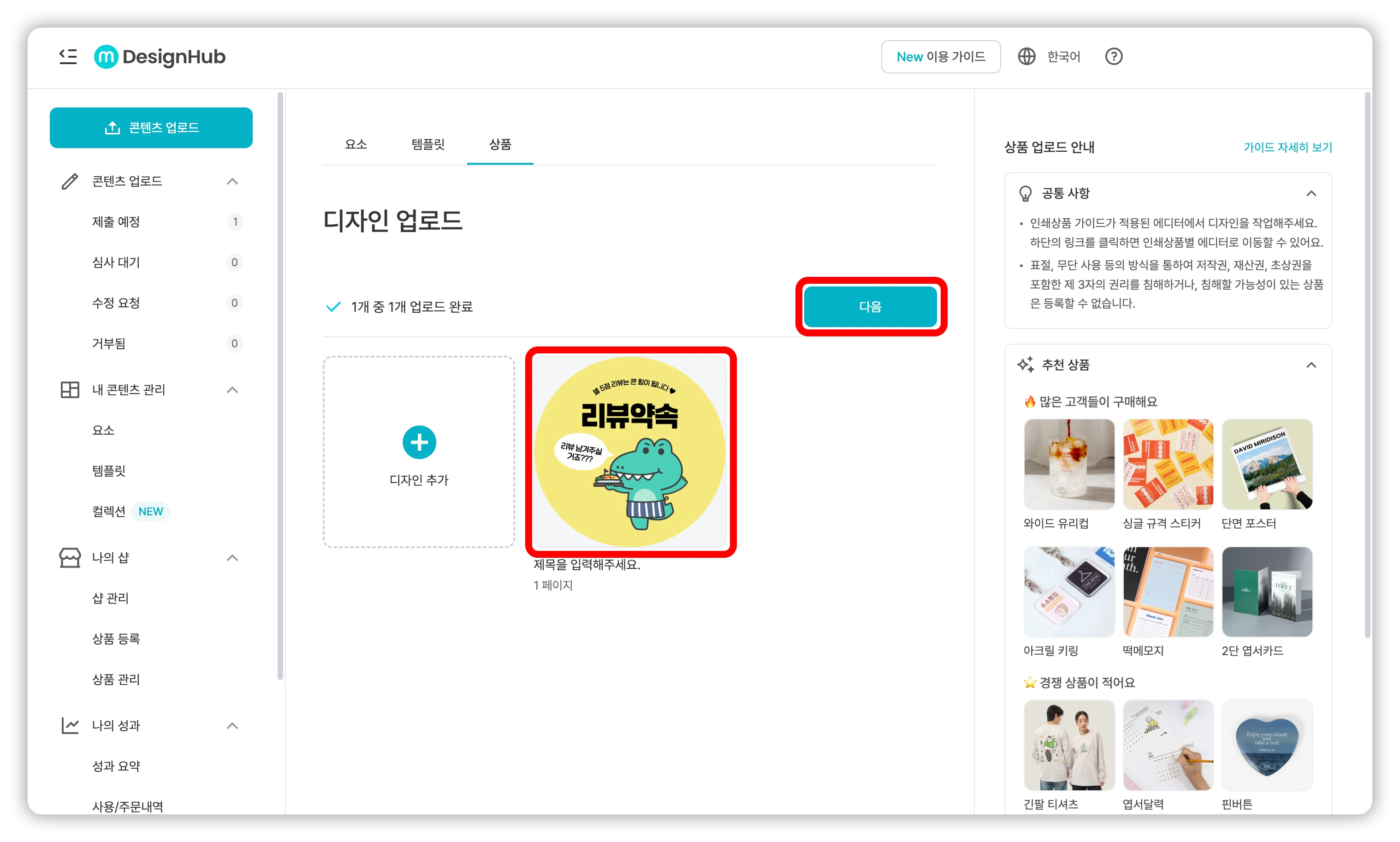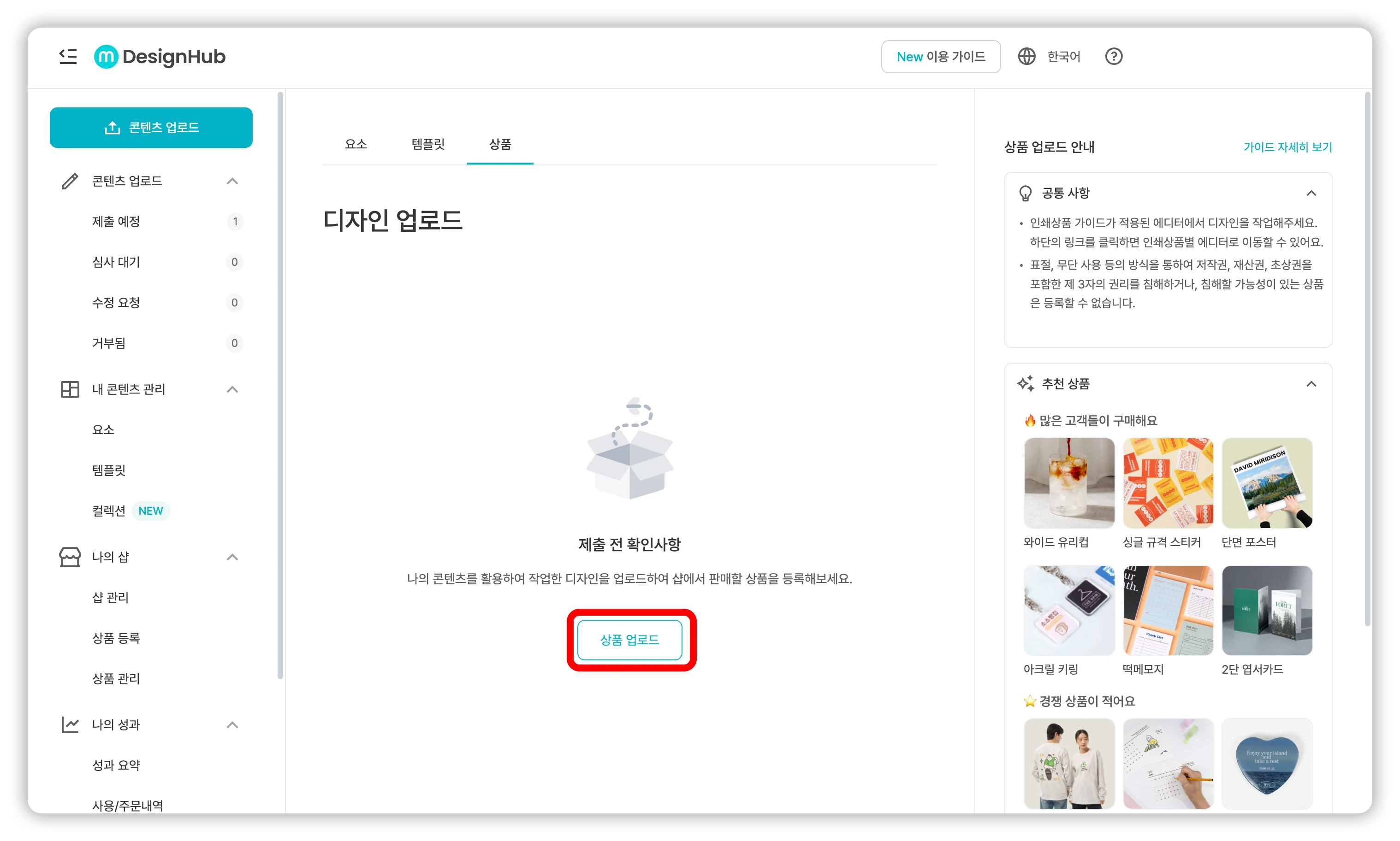 디자인허브 내의 '상품 업로드' 버튼을 클릭하시면,