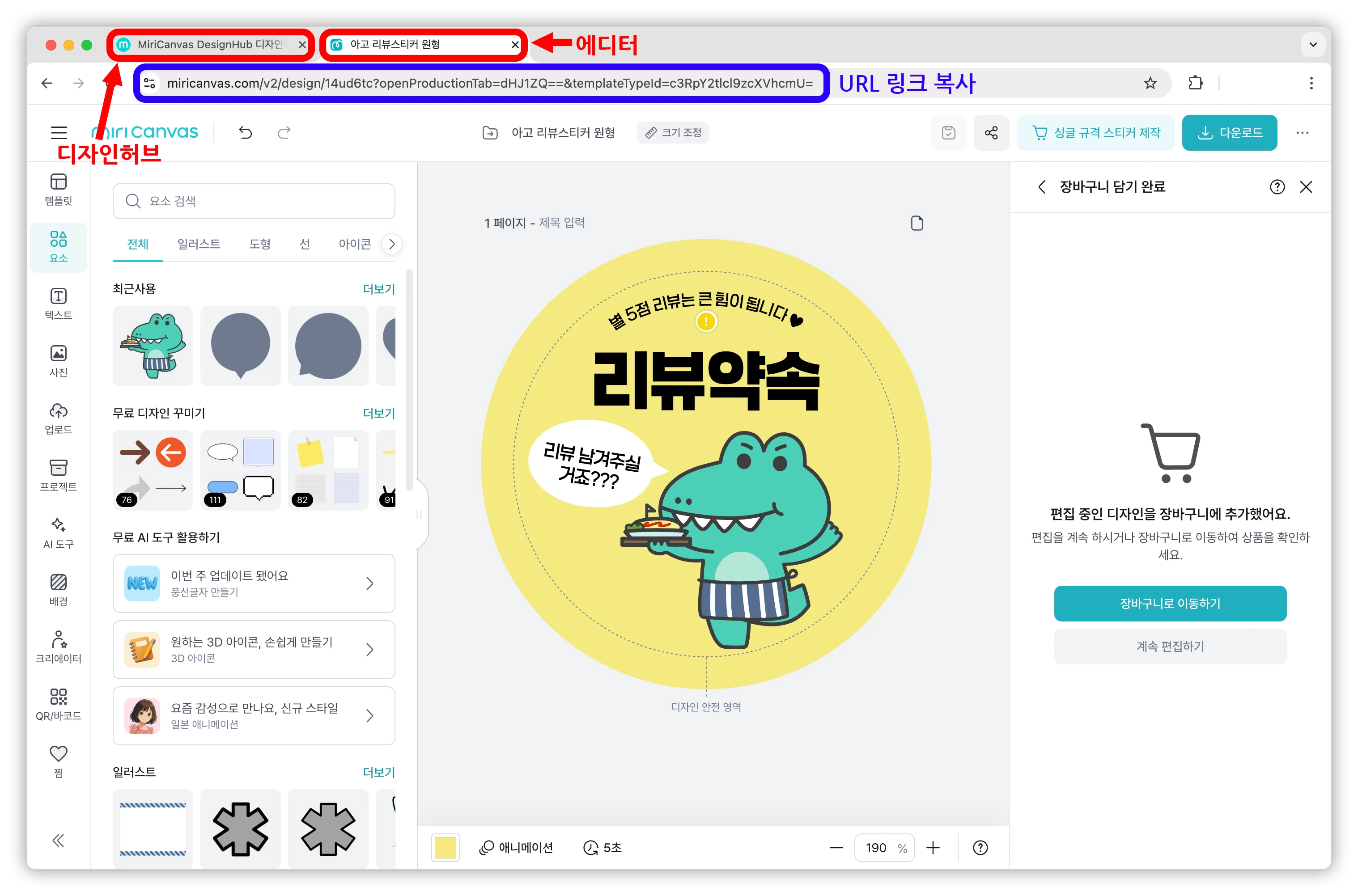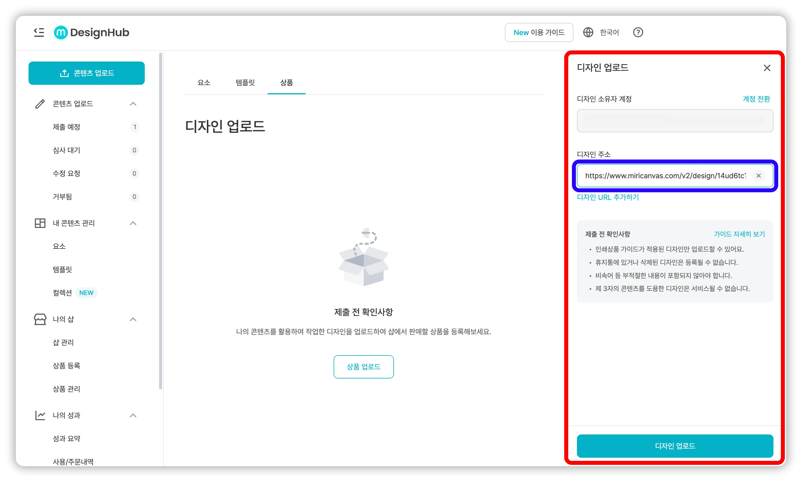 디자인허브로 돌아가서 디자인 업로드하기 (URL 붙여넣기)