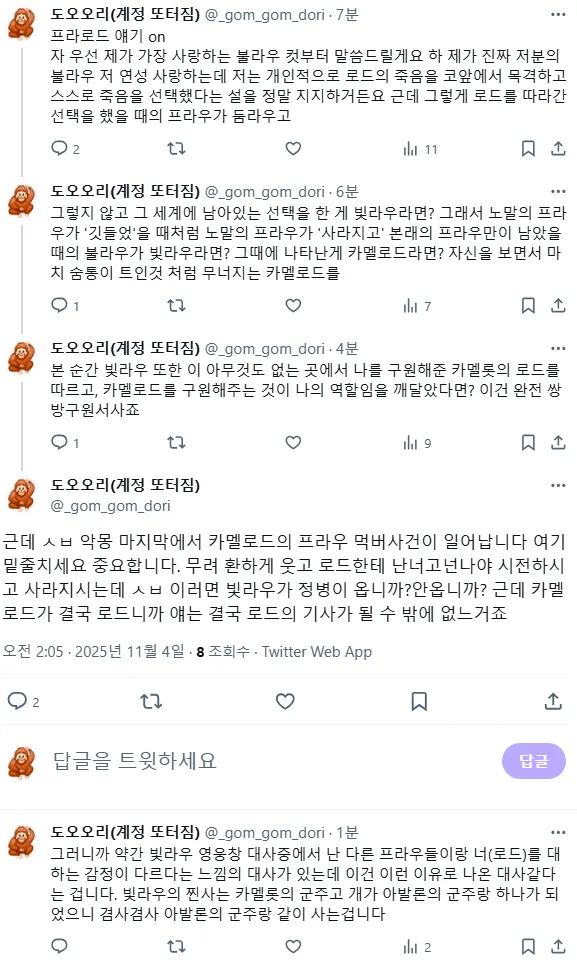 이 침묵..... 이때는 별 생각 없었지만(아니 사실 별생각 없지 않았음 이 침묵 하나로 존나 많이 생각했음) 지금와서 생각해보면 사실 프라우는 로드가 잊어버린 모든 시간선을 기억하고 있던 거 아닐까?