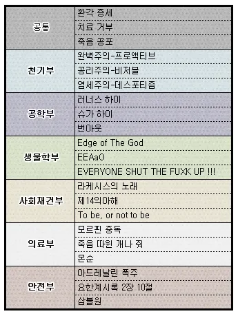 위는 러닝 중 사용될 오류 표로, 공통 3개, 팀 특유 각 3개로 총 21개가 있습니다.