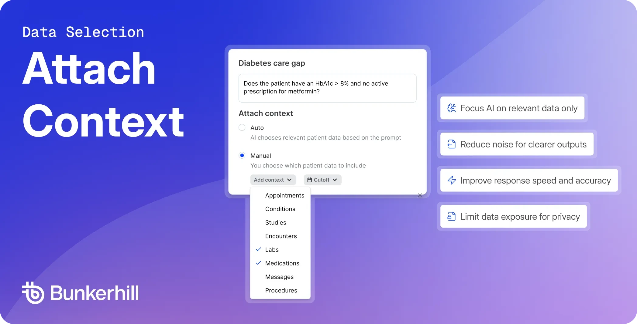 Carebricks now lets you decide exactly which patient data should be considered when answering a question or generating a field. By attaching context, you can focus AI-powered queries on only the most relevant sources — such as labs, medications, or imaging studies — instead of letting them scan everything in the chart. The result: more relevant answers, faster performance, and complete clarity on where the AI is looking. Context control ensures the AI is reasoning from the right information for the task at hand, giving clinicians and care teams greater confidence in every response. The case for context control While Carebricks’ Auto mode can handle most queries without additional input, there are situations where choosing specific data sources adds real value: Sharpening focus — Eliminate noise from unrelated data so outputs stay on topic and avoid irrelevant details. Increasing speed — Narrower inputs mean quicker processing and faster answers, especially for large or complex patient records. Building trust — Know exactly which sources the AI relied on for its response, improving transparency for clinicians, auditors, and patients. Improving accuracy — Anchor reasoning in the most authoritative and relevant information for the specific question or workflow. Supporting advanced workflows — Combine multiple selected sources to power more complex, cross-referenced outputs that require precision and verification. By putting this control in the hands of users, Carebricks helps ensure that AI-generated insights are not only relevant, but also explainable and defensible — essential qualities for use in real clinical environments. More Focus, Better Outcomes Context control enhances Carebricks’ precision, flexibility, and transparency across all supported workflows. From narrowing the scope of a quick query to enabling complex multi-source checks, it ensures the right data informs every answer. This update is another step toward Carebricks’ vision of whole-chart reasoning — where the right data, clinical guidelines, and AI capabilities come together to drive the right next step for every patient. By giving care teams the tools to guide AI reasoning, we’re helping them work more efficiently, make more informed decisions, and ultimately deliver better care.