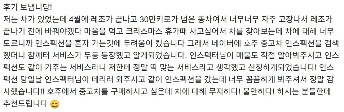호주에서 처음 중고차를 사려고 하니까 진짜 너무 낯설고 걱정됐는데, 참깨터 서비스 덕분에 마음 편하게 차를 볼 수 있었고… 결국엔 완전 만족스러운 차를 성공적으로 구매했어요!! 🤗🚗💛