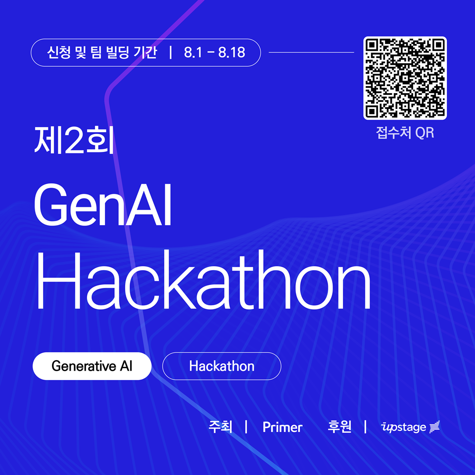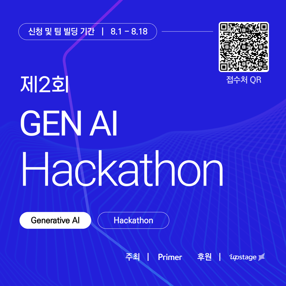 창업의 시작, 프라이머에서 ‘제2회 GenAI 해커톤’ 개최 AI 창업 활성화와 AI 인재들의 팀 빌딩의 기회의 장 입상 팀 모두에게 Solar LLM Credit $5,000과 상금 수여 참가자 전원에게 Solar LLM으로 해커톤을 할 수 있게 서비스 제공