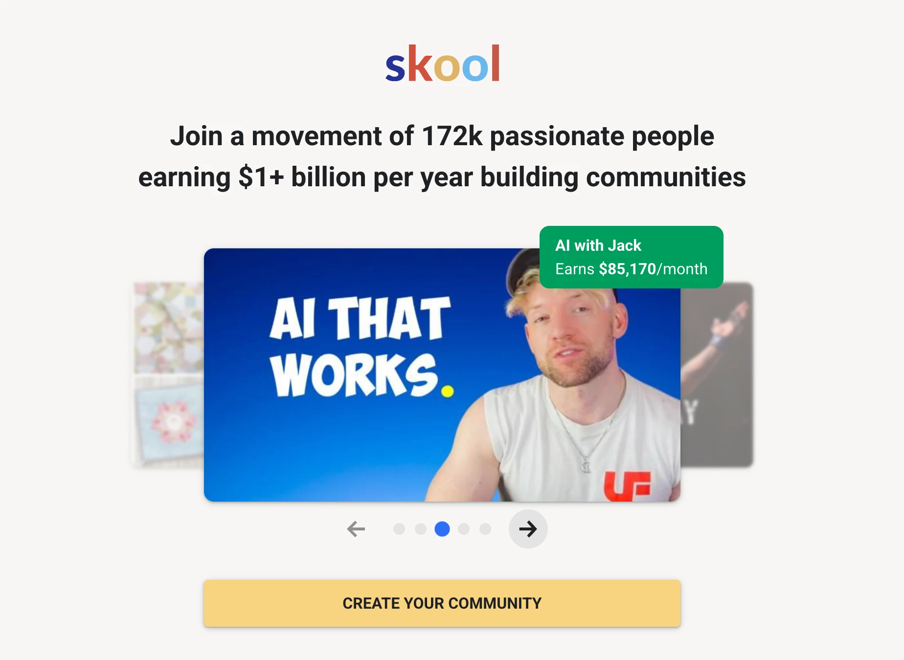 Skool 커뮤니티 생성하려고 할 때 17만명이 커뮤니티 빌딩으로 매년 10억달러 벌고 있다는 문구