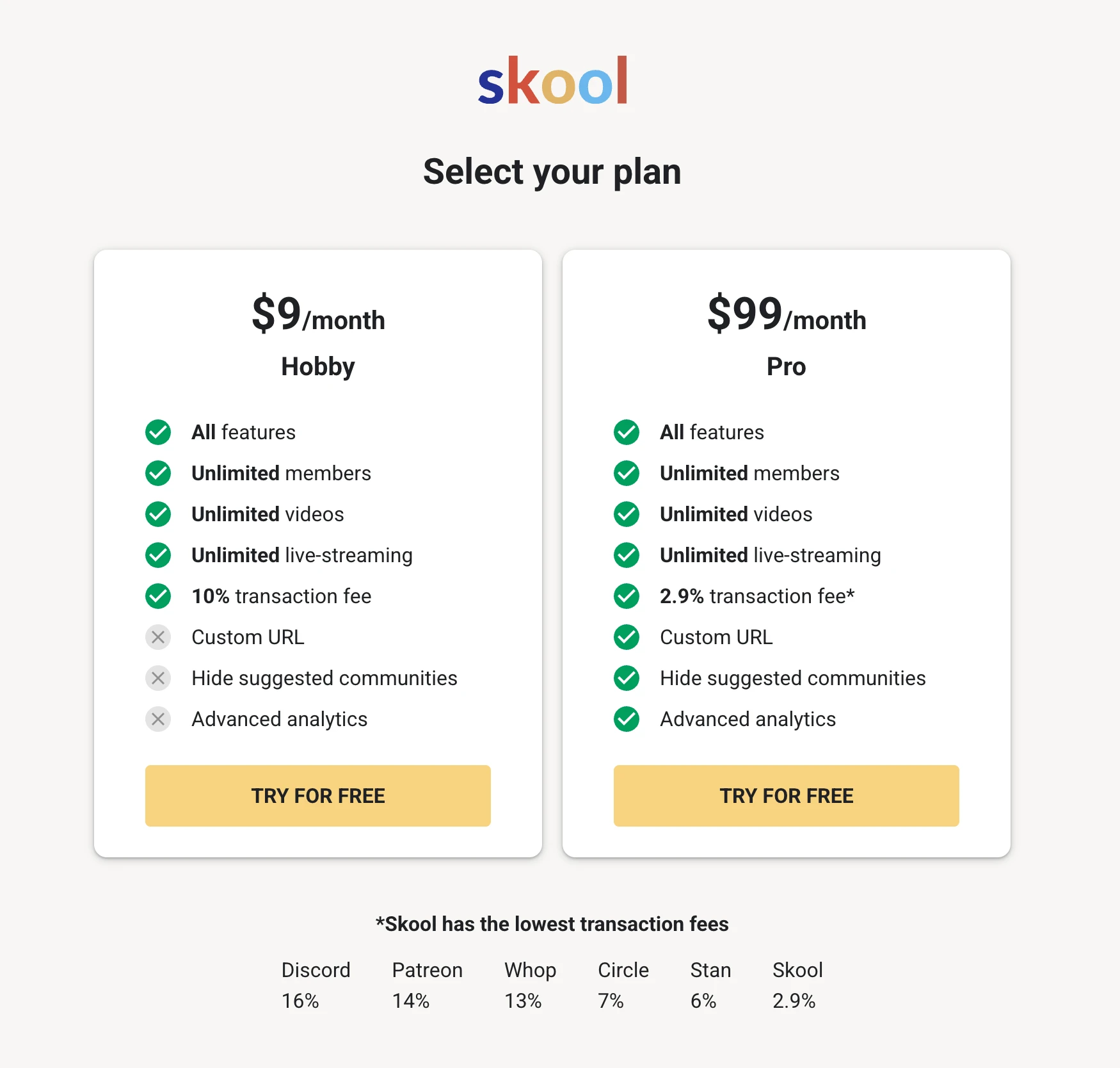 Skool 플랜 선택 시 타 서비스와 Transaction fee 비교