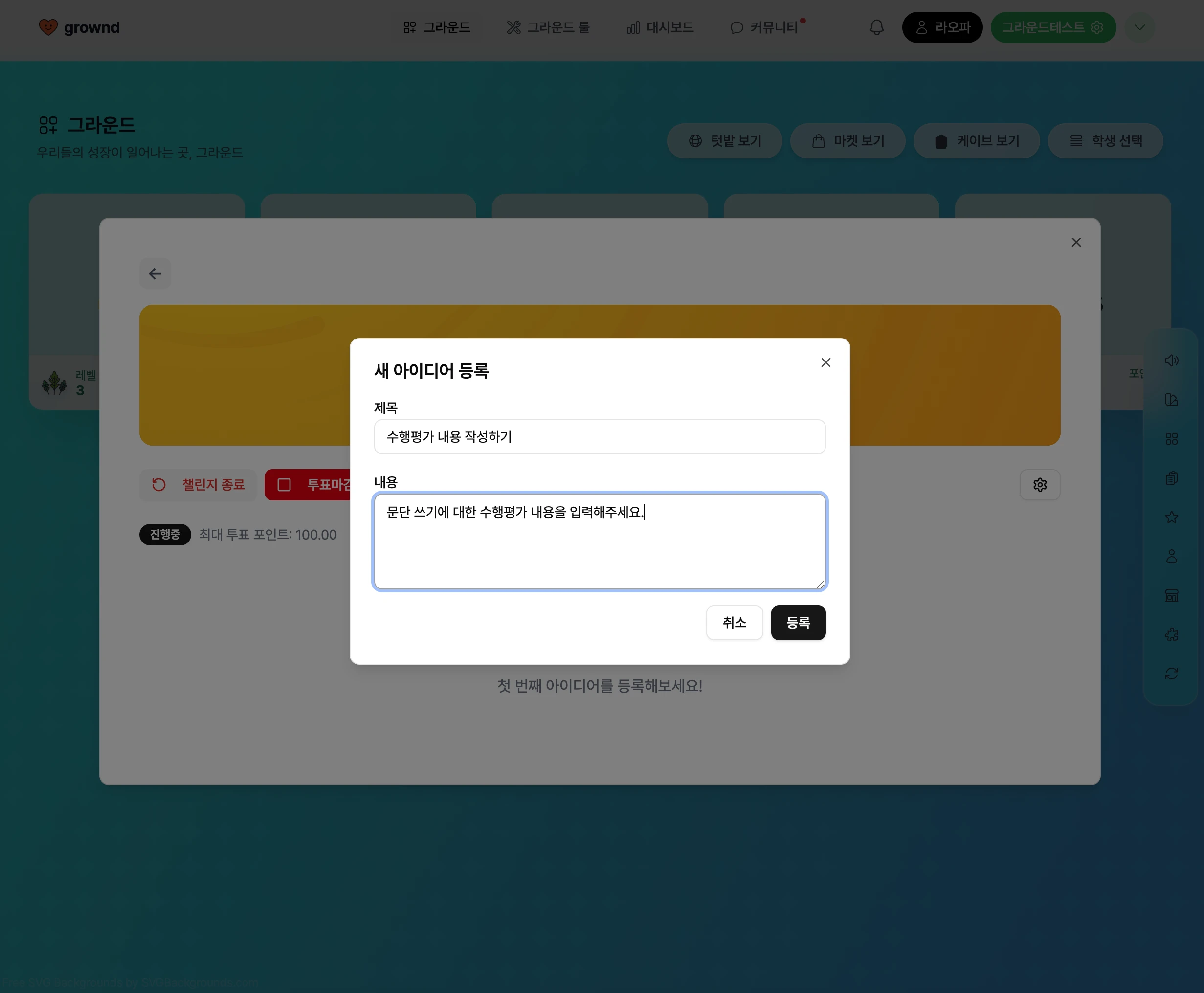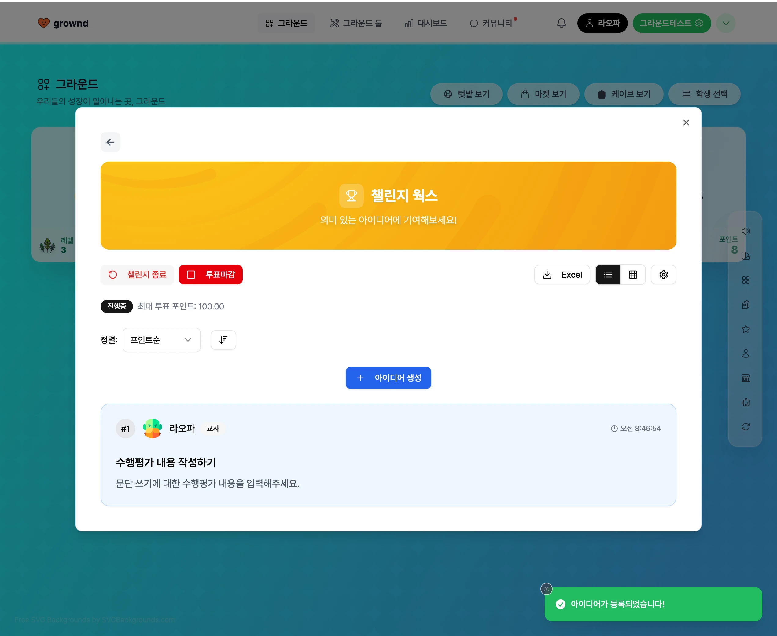 ํ์๋ค์ ์์ด๋์ด๋ฅผ ์๋ก ํฌ์ธํธ ๊ธฐ๋ฐ ์ถ์ฒ์ ํตํด ์ฐ์ ์์ด๋์ด์ ๋ณด์์ ํ ์ ์๋ ์์ด๋์ด ์ฑ๋ฆฐ์ง ๊ธฐ๋ฅ์