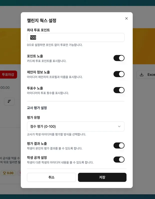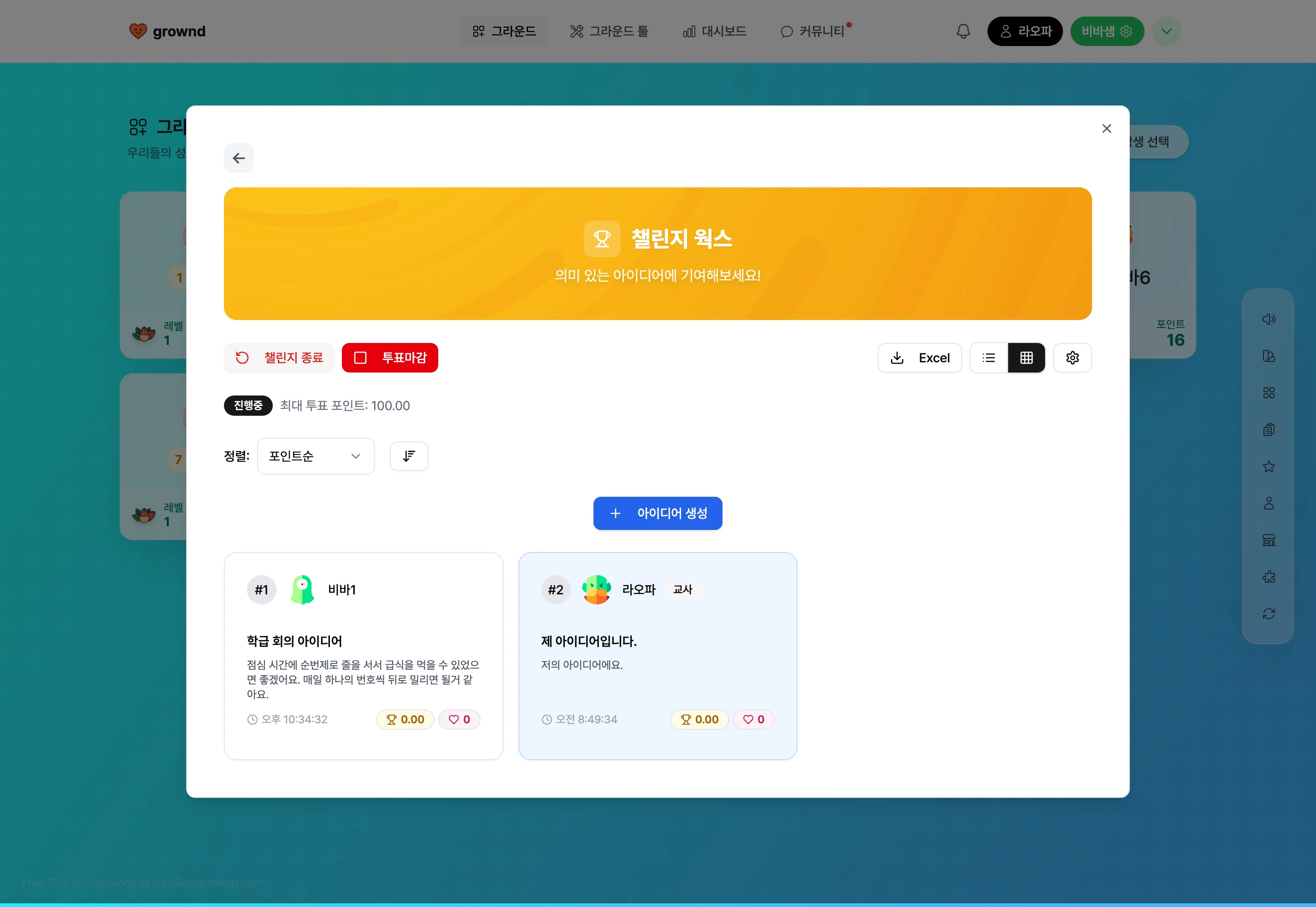 ๋๋ค. ์์ด๋์ด ์ฑ๋ฆฐ์ง๊ฐ ์งํ ์ค์ผ ๊ฒฝ์ฐ ํ์๋ค์ ์ฑ๋ฆฐ์ง ๋ชฉ๋ก์ ๋ํ๋๋ฉฐ, ํฌ์ธํธ ๊ธฐ๋ฐ ํฌํ๋ฅผ ์งํํ ์ ์์ต๋๋ค.
