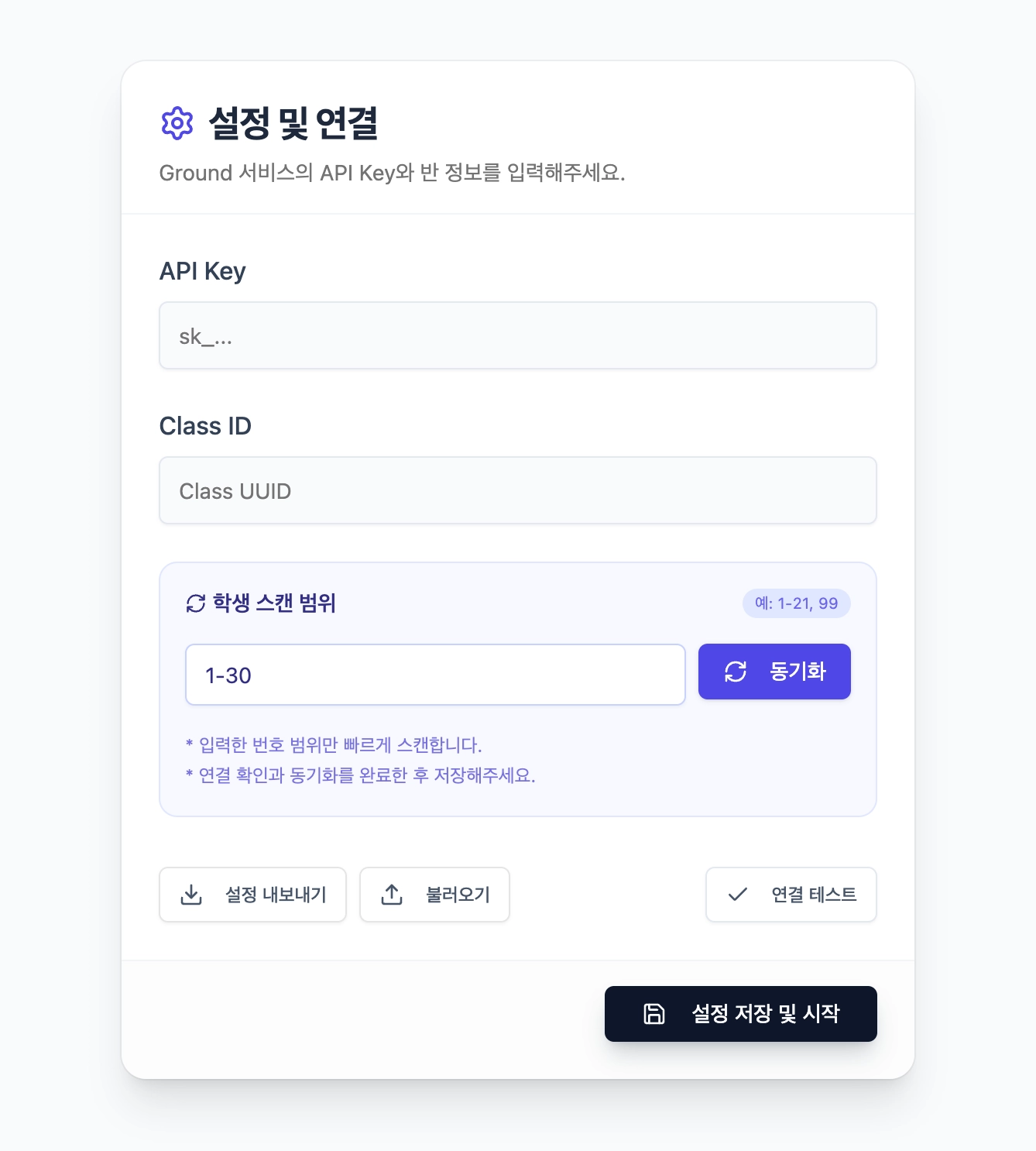 API 키와 클래스 ID를 입력하시고, 주로 사용하시는 칭찬,노력 포인트 카드를 생성하셔서 손쉽게 포인트를 부여하실 수 있습니다.