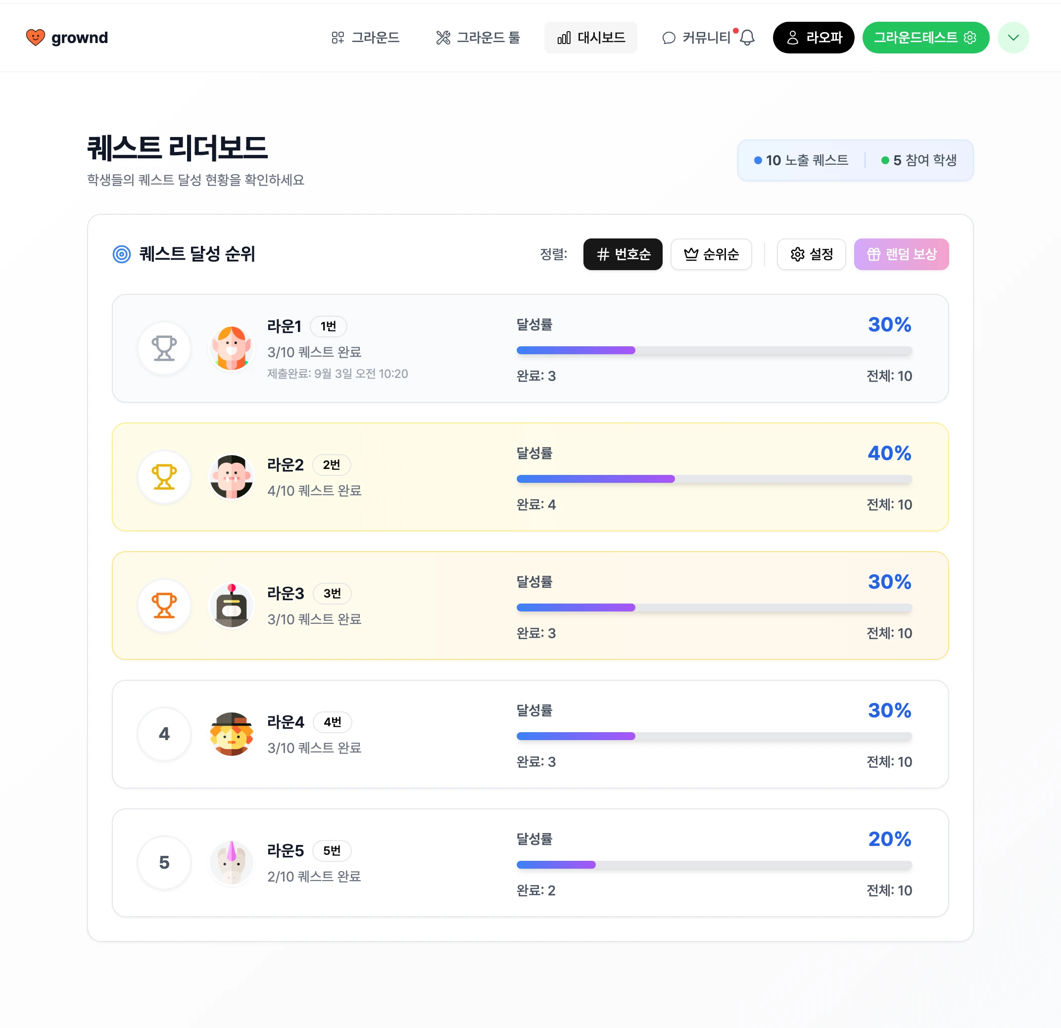 퀘스트 리더보드는 학생들에게 공개된 퀘스트의 달성 성과 여부를 순위별로 나타내며, 학생들의 퀘스트 성취 욕구를 더욱 강화 할 수 있는 기능입니다. 퀘스트 리더보드는 [대시보드] 메뉴 - [퀘스트 리더보드] 에서 사용할 수 있습니다.