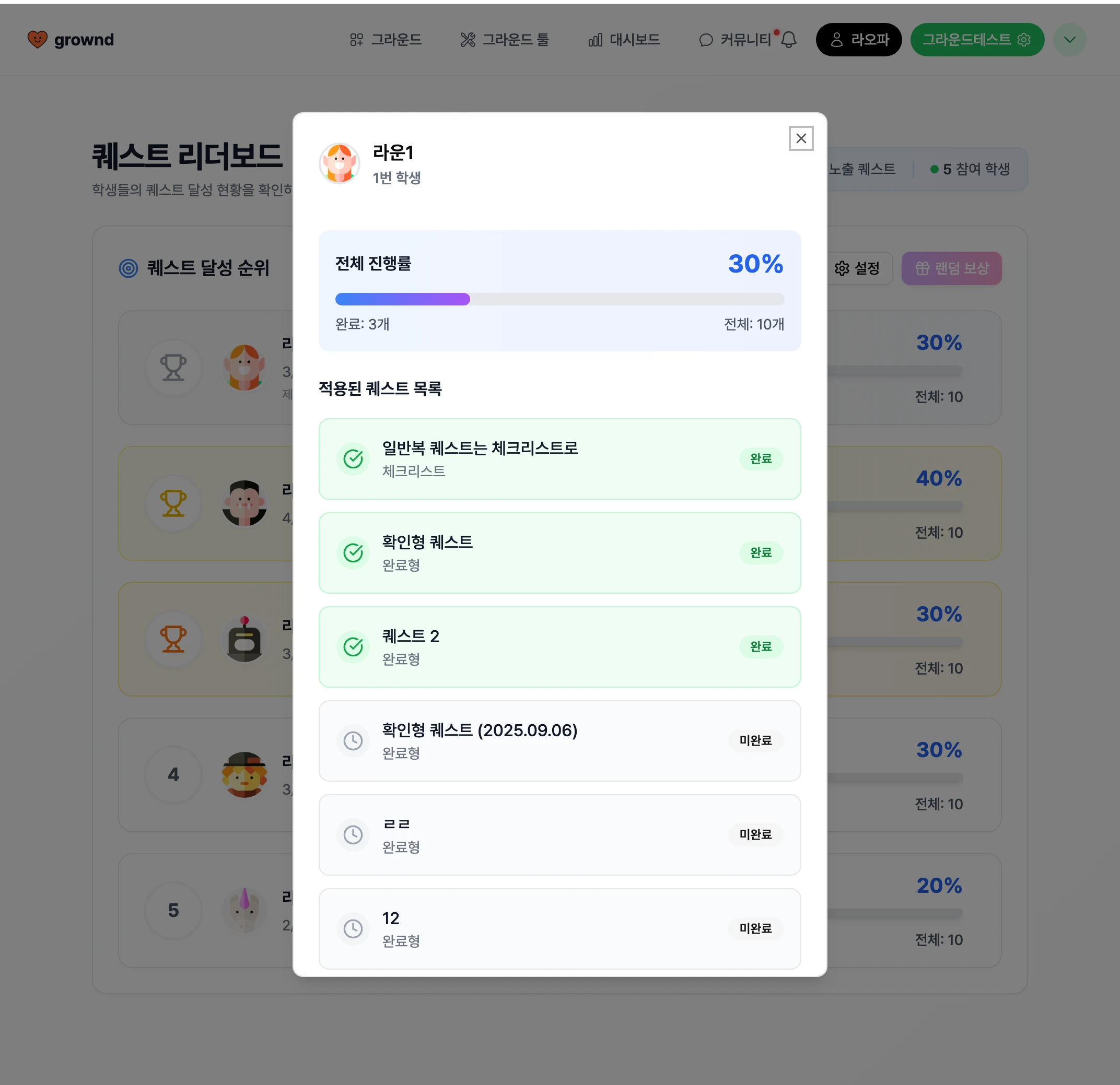 학생 개별 퀘스트 진행률을 확인할 수 있습니다.