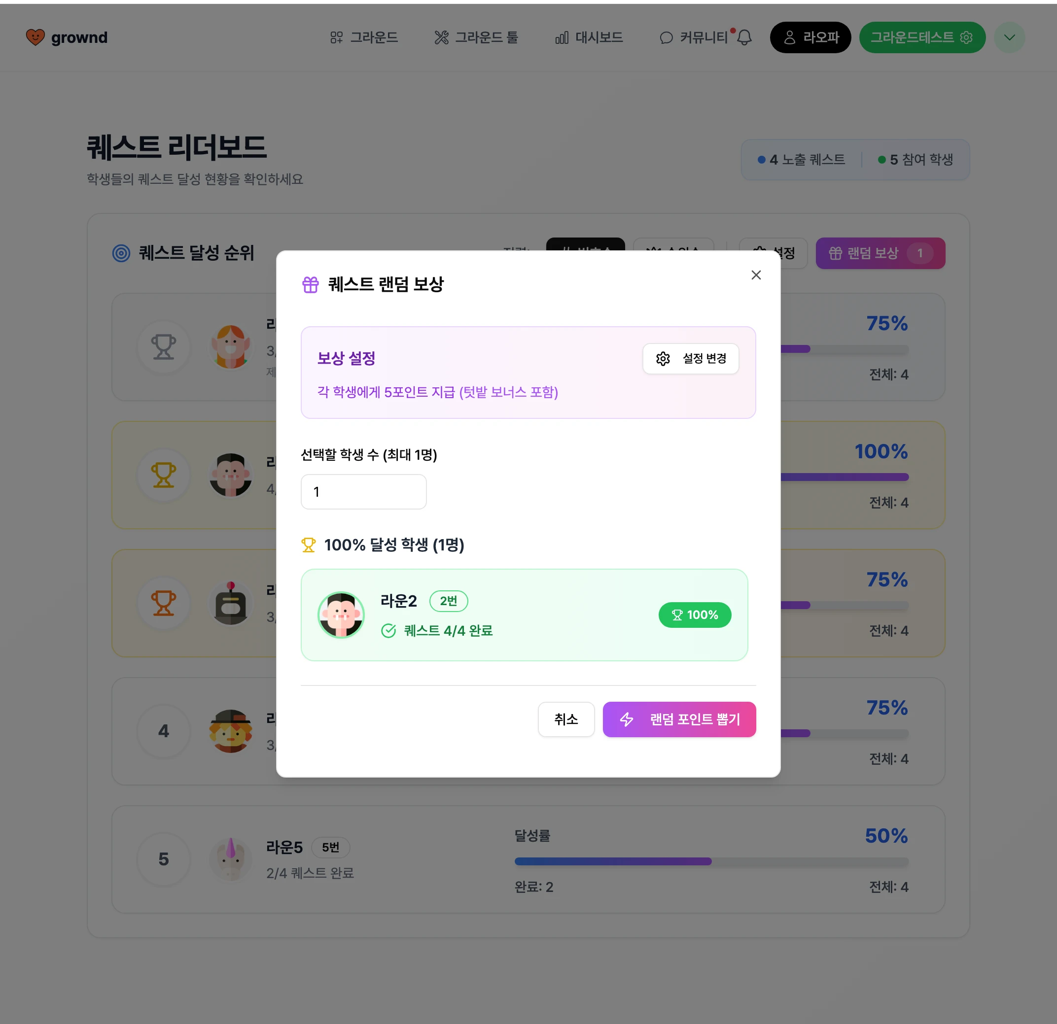 랜덤 포인트 뽑기 기능을 통해 퀘스트 100% 달성 학생에 대한 추가 보너스를 지급하여, 학생들의 성취 동기를 강화할 수 있습니다.