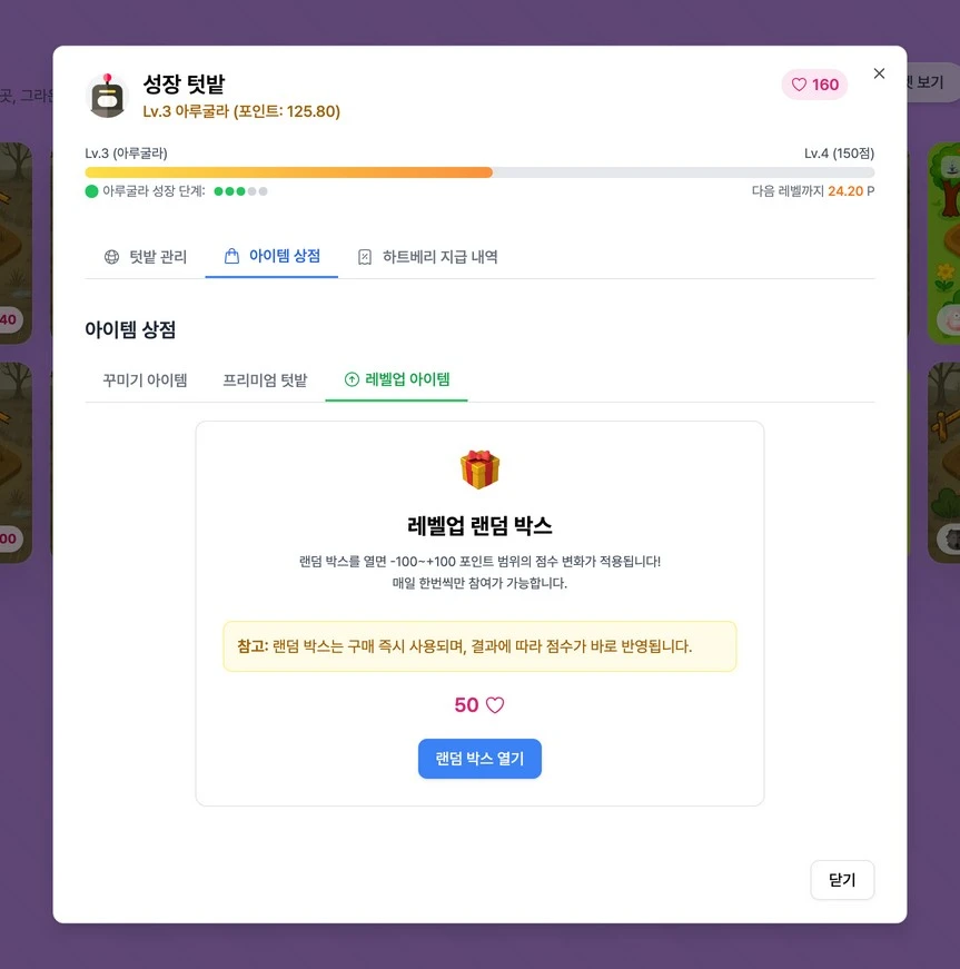 아이템 상점에서 시스템에 등록된 아이템을 구매할 수 있으며, 아이템은 지속적으로 추가될 예정입니다. 프리미엄 텃밭은 텃밭의 배경을 변경하는 아이템이며, 동일하게 보너스 포인트가 적용됩니다.