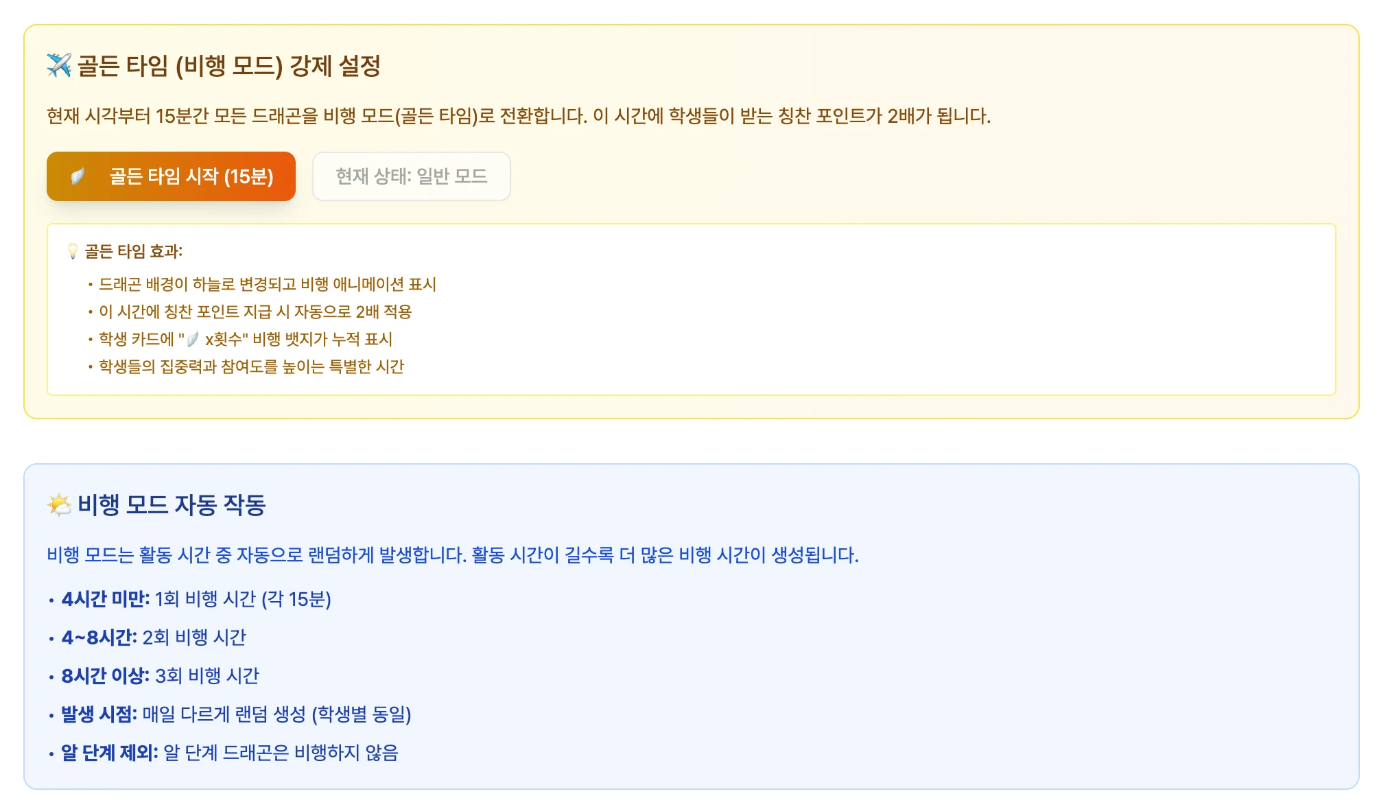 특히 드래곤 떠남 주기는 학생이 먹이를 지급한 지 설정한 일수가 지나도 먹이가 지급되지 않으면, 드래곤이 초기화 되는 기능으로 적절히 일수를 조정하여, 학생들이 본인들의 드래곤에 애착을 가지고 먹이를 지급 받기 위한 긍정적 활동을 할 수 있도록 학생의 활동을 강화 할 수 있습니다.