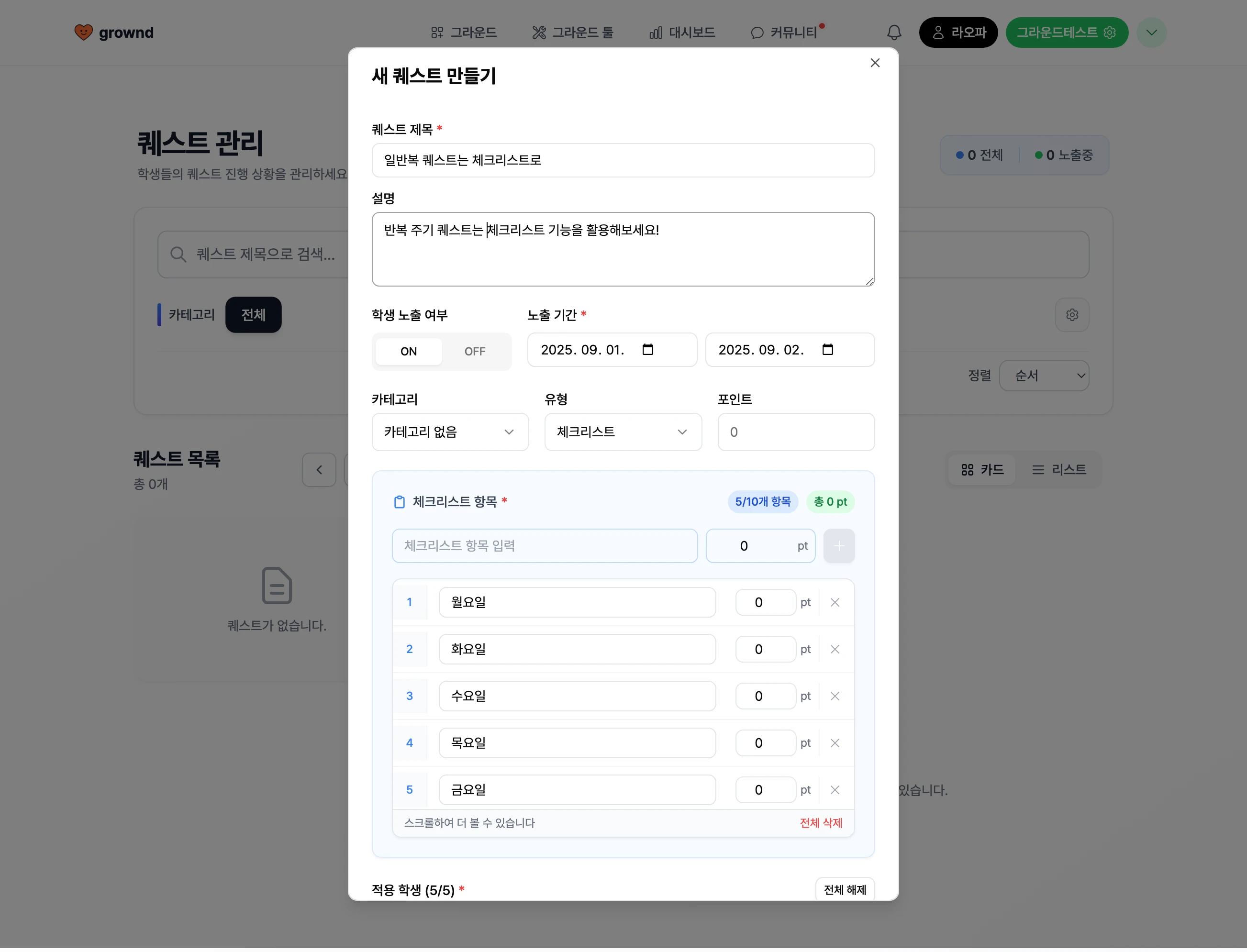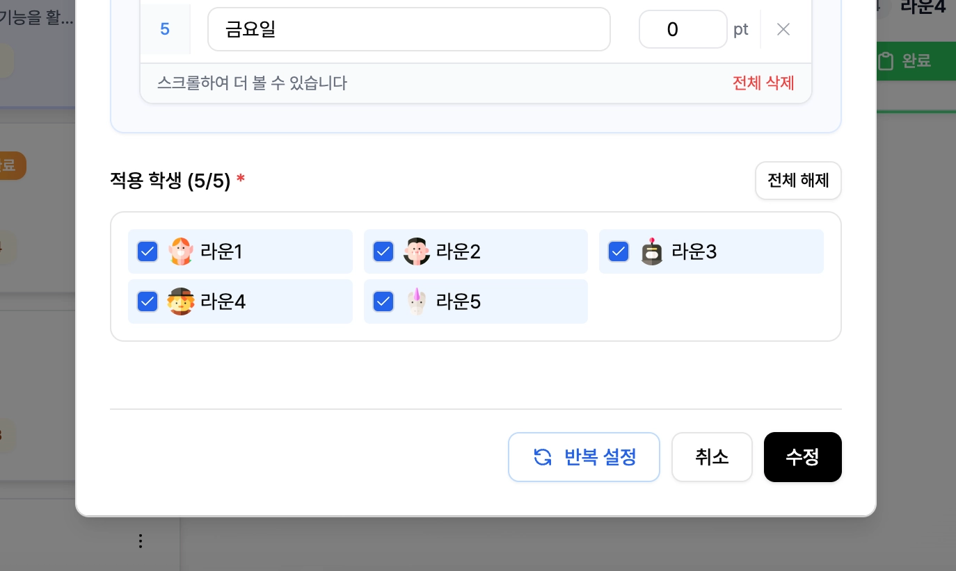 반복 퀘스트 설정을 통해 퀘스트가 복제될 요일을 선택할 수 있으며, 반복 퀘스트가 설정된 퀘스트의 경우 해당 요일에 교사가 퀘스트 페이지에 접속하면 자동 복제를 지원합니다.