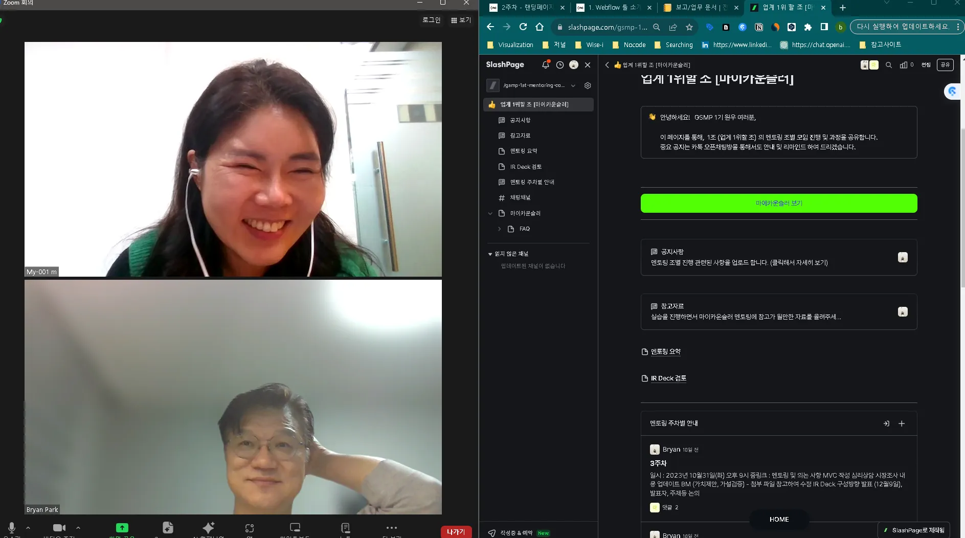 일시 : 2023년 11월 14일(화) , 오후 9시, 줌미팅 [투자 상담 실습] 1. 비즈니스 모델, 제품/서비스가 무엇인가? 2. 매출 발생 형태 / 구조는 어떻게 되며, 주요 매출은 어디에서 발생하는가? 3. 시장규모, 경쟁사, 리스크(제도, 규제, 라이선스등) 는 무엇인가? 차별화, 강점, 극복방안 4. 현재 주요 고객은 ? 고객 확대 방안은 ? 5. 향후 성장 전망과 펀딩을 받는 이유 ? 6. 팀 빌딩 및 C레벨 영입 계획은 ?