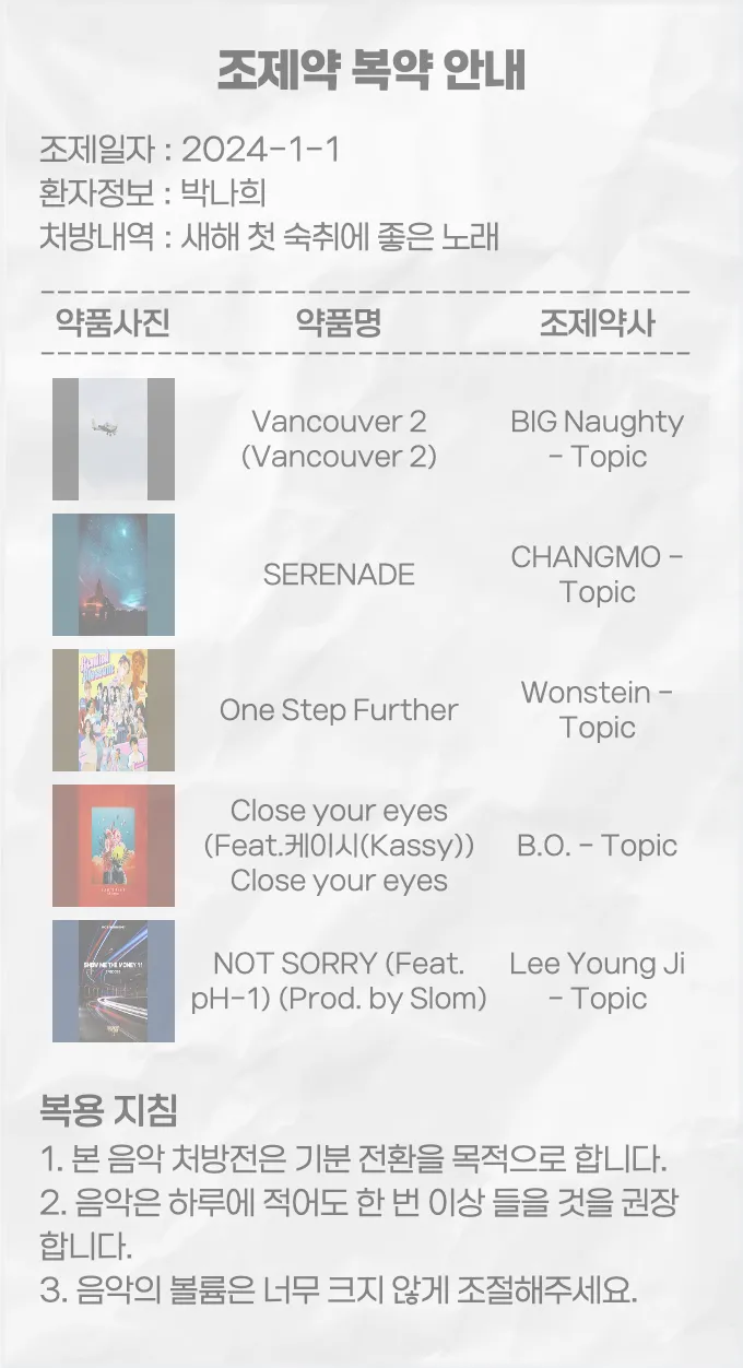참고로 저 방법은 한 번만 쓸 수 있으니 이제 디자인 찬스는 끝난 겁니다. 나머지는 폰트와 마크다운 감성으로 풀어내는데 중점이 되었습니다. 처방전 컨셉을 피하려다 보니 영수증 컨셉이 된 것 같지만 약사 친구말로는 요즘엔 약봉지가 영수증 기능을 대신한다고 합니다. 참 신기한 세상입니다.