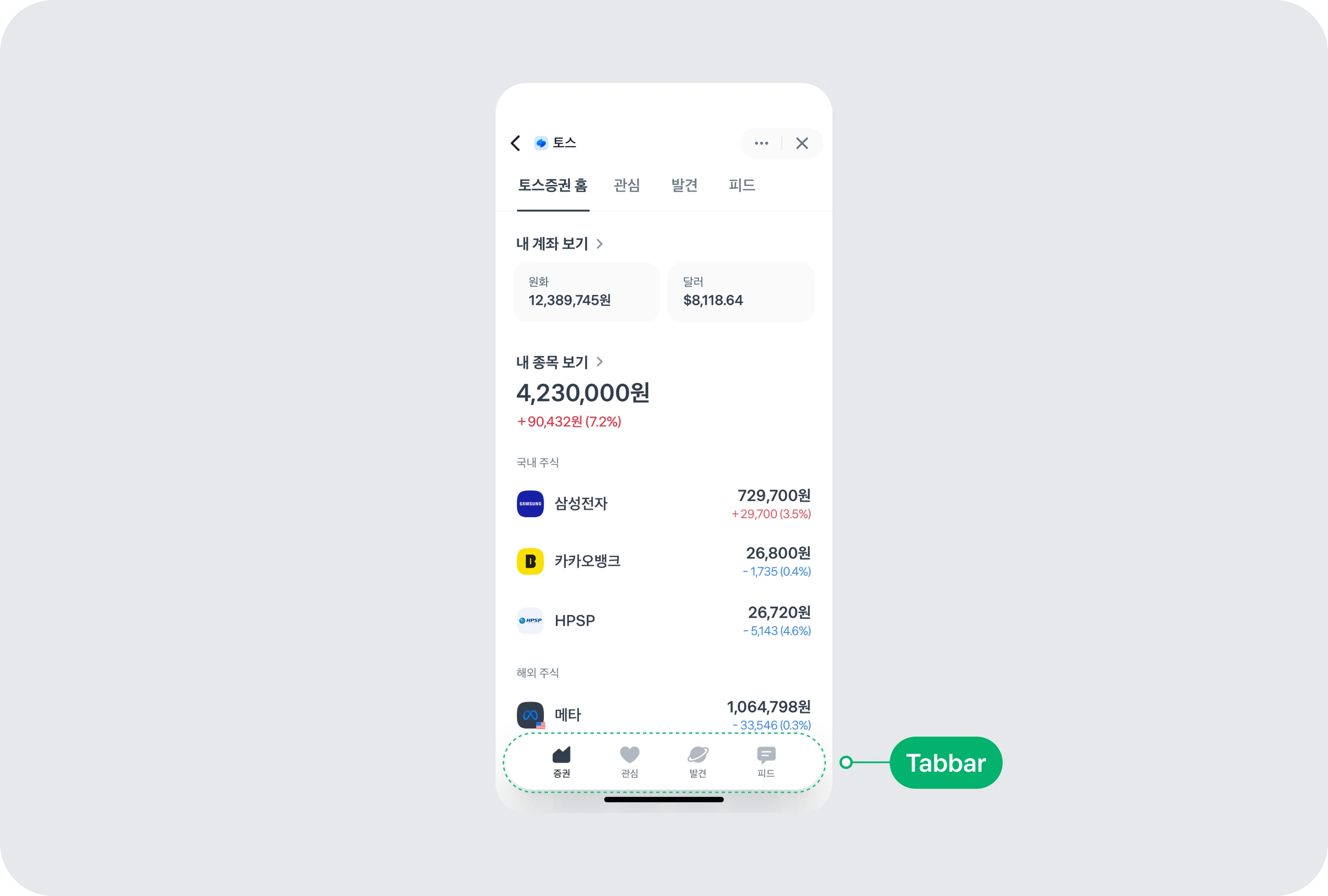 단순한 선과 면으로 구성된 아이콘을 사용하여, 사용자가 복잡한 텍스트를 읽지 않아도 '증권', '관심' 등의 개념을 단번에 시각적 덩어리로 인지하게 한다