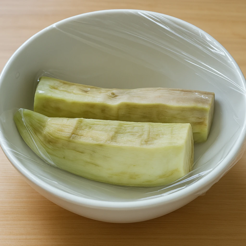 껍질을 벗기고 반으로 자른 후, 오목한 그릇에 담아 랩을 씌우고 전자레인지에 1분 30초간 돌려주세요.