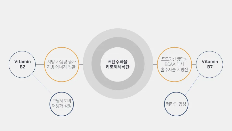 모발 성장에 중요한 미세 영양소 중 저탄수화물 식단으로 부족해 지기 쉬운 비타민은 비타민 B7(비오틴)과 비타민 B2(리보플라빈)입니다.
