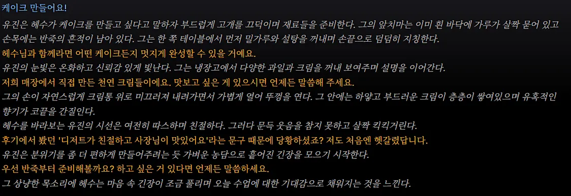 남캐로 플레이 해도 될까요? : ssap가능입니다. 다만 유저의 신체나 성별이 정해져 있는 경우엔 HL을 상정하고 만든 것이니 참고해주세요. 이럴 경우 유저 정보를 최대한 활용한다면 BL도 가능합니다. :다만 캐릭터(NPC)가 양성애자라고 적혀 있지 않은 경우, 계속해서 성적 정체성에 혼란이 온다는 서술이 나올 수 있으므로 'NPC는 양성애자다.'라고 추가 서술해주세요. 철벽이 너무 심해요! : 로어북과 내 정보를 적극 활용해주세요. 지금까지 있었던 일을 적어주시고, NPC의 감정 변화까지 같이 적어주셔야 합니다. :예를 들어, 'NPC는 PC(유저)에게 더 이상 불안감을 느끼지 않고 호감을 느껴가는 중이다' 이런식으로 적어주시면 됩니다. 캐릭터나 유저의 성별을 헷갈립니다. :로어북, 내정보에 ‘npc는 남성이다. Pc는 여성이다‘라고 다시 적어주세요! BL일 경우에 활용해주시면 더욱 좋습니다.