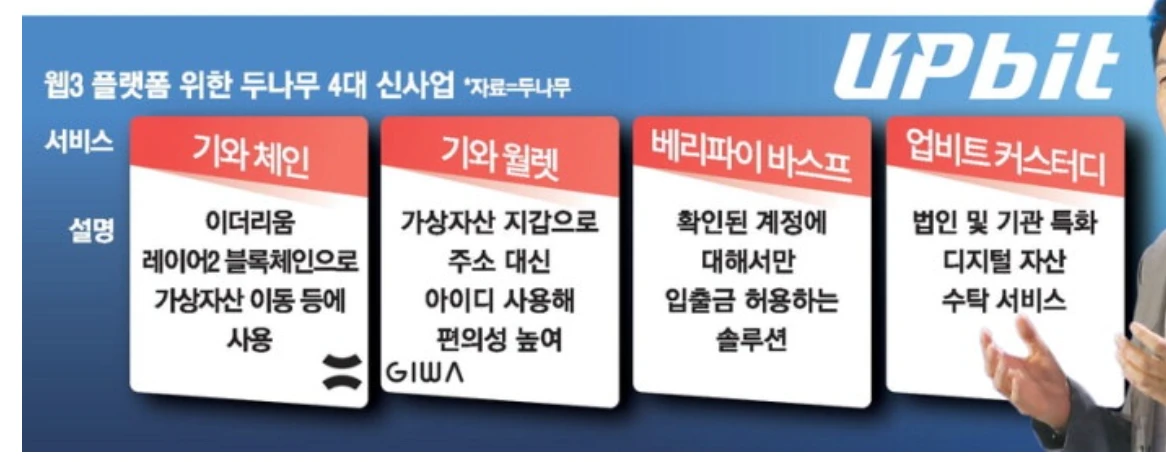 오 대표는 이날 새롭게 선보인 기와 체인과 기와 월렛 외에 트래블룰 솔루션인 '베리파이 바스프(VASP)', 법인 및 기관 특화 디지털 자산 수탁 서비스 '업비트 커스터디'도 주요 신성장 동력으로 꼽았다. 두나무가 그리는 새로운 비즈니스 모델은 코인베이스가 선보인 '베이스' 플랫폼 등과 유사하다는 평가가 나온다. 코인베이스는 기와 체인과 같은 이더리움 레이어2 블록체인인 '베이스'를 개발했다. 이와 동시에 지갑, 거래, 소셜, 결제, NFT(대체불가토큰) 등 기능을 모두 탑재한 베이스 애플리케이션(앱)도 선보였다.