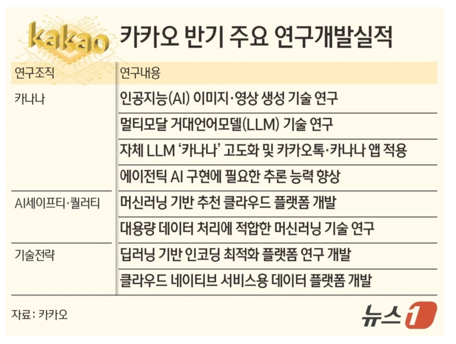 주요 연구개발 프로젝트 역시 AI를 중심으로 진행 중이다. 특히 자사 AI 서비스 전체를 '카나나'로 브랜딩하겠다고 밝힌 만큼, 연구조직 '카나나' 아래 멀티모달·생성형 AI·AI 에이전트 모델 등 연구를 이어가고 있다.