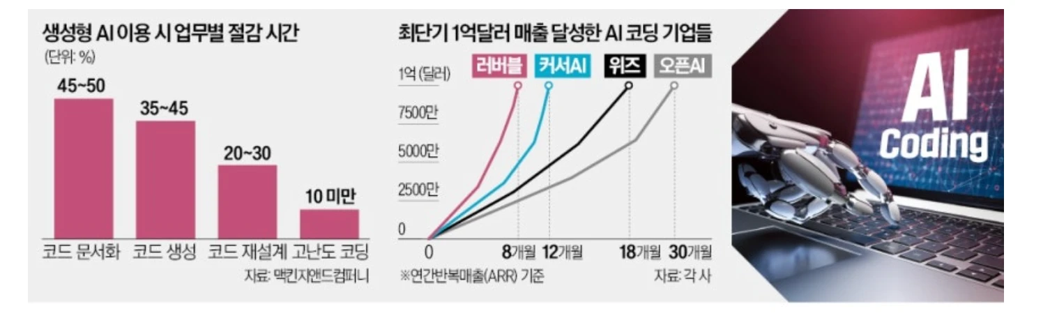 바이브코딩 보급은 AI 코딩 도구 개발사의 가치를 빠르게 끌어올리고 있다. 파이낸셜타임스(FT)에 따르면 러버블은 최근 기업가치를 40억달러(약 5조5000억원)로 인정받는 투자를 검토하고 있다. 7월 중순 투자 당시 17억달러로 인정받은 기업가치가 한 달 만에 두 배로 뛴 것이다. 2023년 스웨덴에서 창업해 작년 말 제품을 처음 출시한 러버블은 복잡한 코드 대신 문장 몇 개로 프로그램을 만드는 바이브코딩 솔루션을 제공한다. 커서AI 개발사 애니스피어의 기업가치는 작년 말 25억달러에서 지난 6월 99억달러로 네 배 가까이 치솟았다.