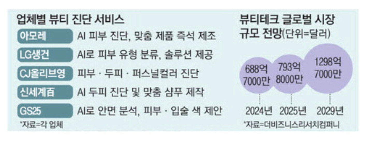 심지어 편의점들도 AI 뷰티 서비스를 본격 도입했다. GS25는 외국인들이 자주 방문하는 GS25뉴안녕인사동점에 'AI 뷰티 디바이스'를 설치해 체험형 서비스를 2000원에 제공하고 있다. 연내에 10개 점포까지 확대할 예정이다. 고객이 디바이스 화면에 얼굴을 비추면 카메라가 피부, 눈, 입술을 스캔한 뒤 피부 명도, 채도, 색온도 등을 분석해 개인별 퍼스널컬러를 안내해준다. 얼굴형을 정밀 분석한 결과를 제공해 AI 스타일 컨설턴트가 메이크업, 헤어, 주얼리 스타일도 제안한다.