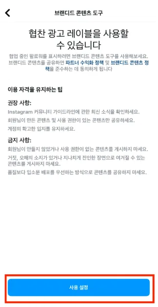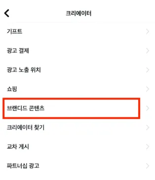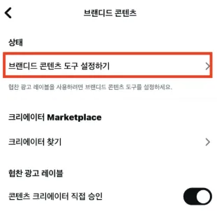 브랜디드 콘텐츠 사용 설정이 되어있는지 확인