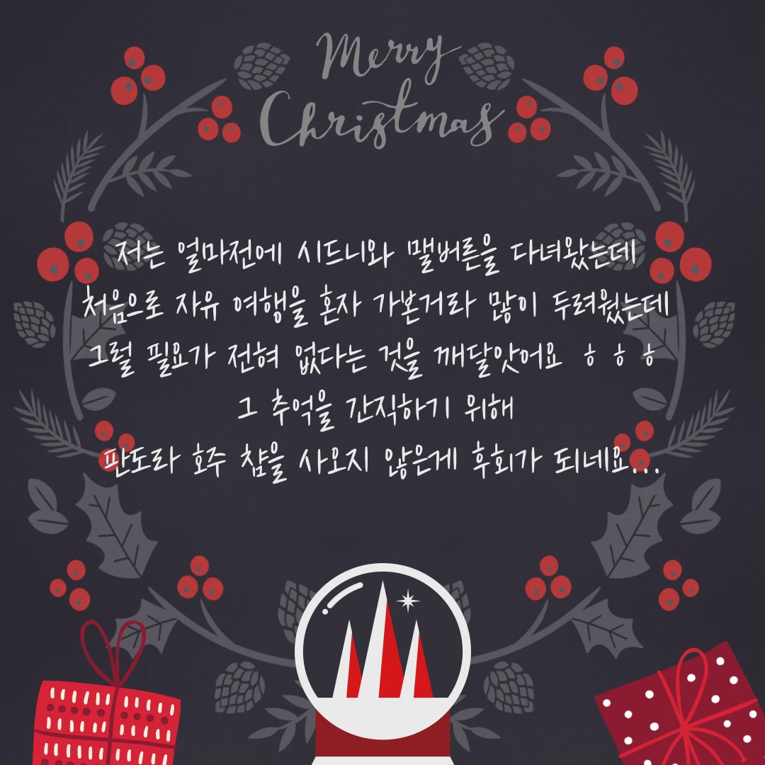 저니랩 산타는 아직 호주에 선물을 배달해 본 적은 없어 궁금하네요😉