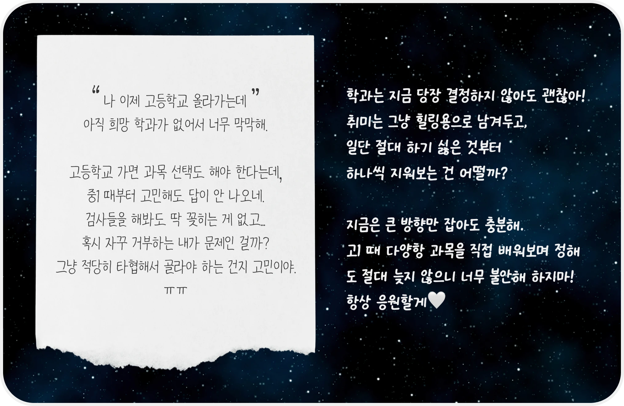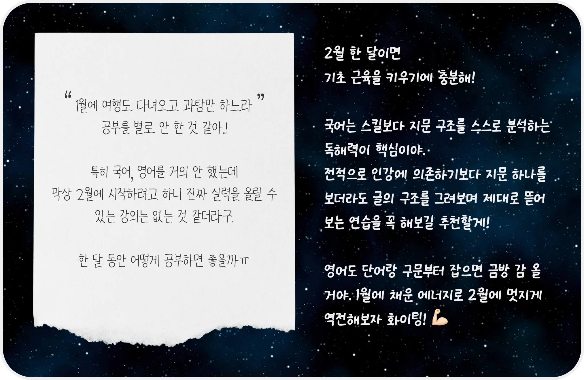 모르면 손해! 예비 고3을 위한 수능 공부법 연대 합격생이 알려주는 예비 고3이 방학 동안 수능 공부하는 법! 막연했던 고3, 드디어 코 앞으로 다가왔어! 앞으로 1년 남짓한 시간, 본격 수험생 모드로 돌입해야겠지? 오늘은 연대 김민수 멘토쌤이 알려주는 예비 고3이 방학동안 챙기면 좋을 것들, 수능 공부하는 팁에 대해 이야기해줄거야! 📌 매일이 수능인 것처럼 생활할 것 방학 동안 수능용 생활 패턴으로 살아보기! 수능에서 1교시인 국어가 오전 8시 40분에 시작되고, 점심시간이 오후 12시 10분부터 오후 1시 10분이라는 것, 4교시인 한국사~사회/과학/직업탐구가 오후 4시 32분에 끝난다는 것 모두 알고 있지? 입실 ~8시 10분 1교시: 국어 8시 40분~10시 00분(80분) 2교시: 수학 10시 30분~12시 10분(100분) 3교시: 영어 13시 10분~14시 20분(70분) 4교시:한국사 + 사회/과학/직업탐구 한국사-14시 50분~15시 20분(30분) 사회/과학/직업탐구-15시 30분~16시 32분(62분) 5교시: 제2외국어/한문 17시 00분~17시 40분(40분)