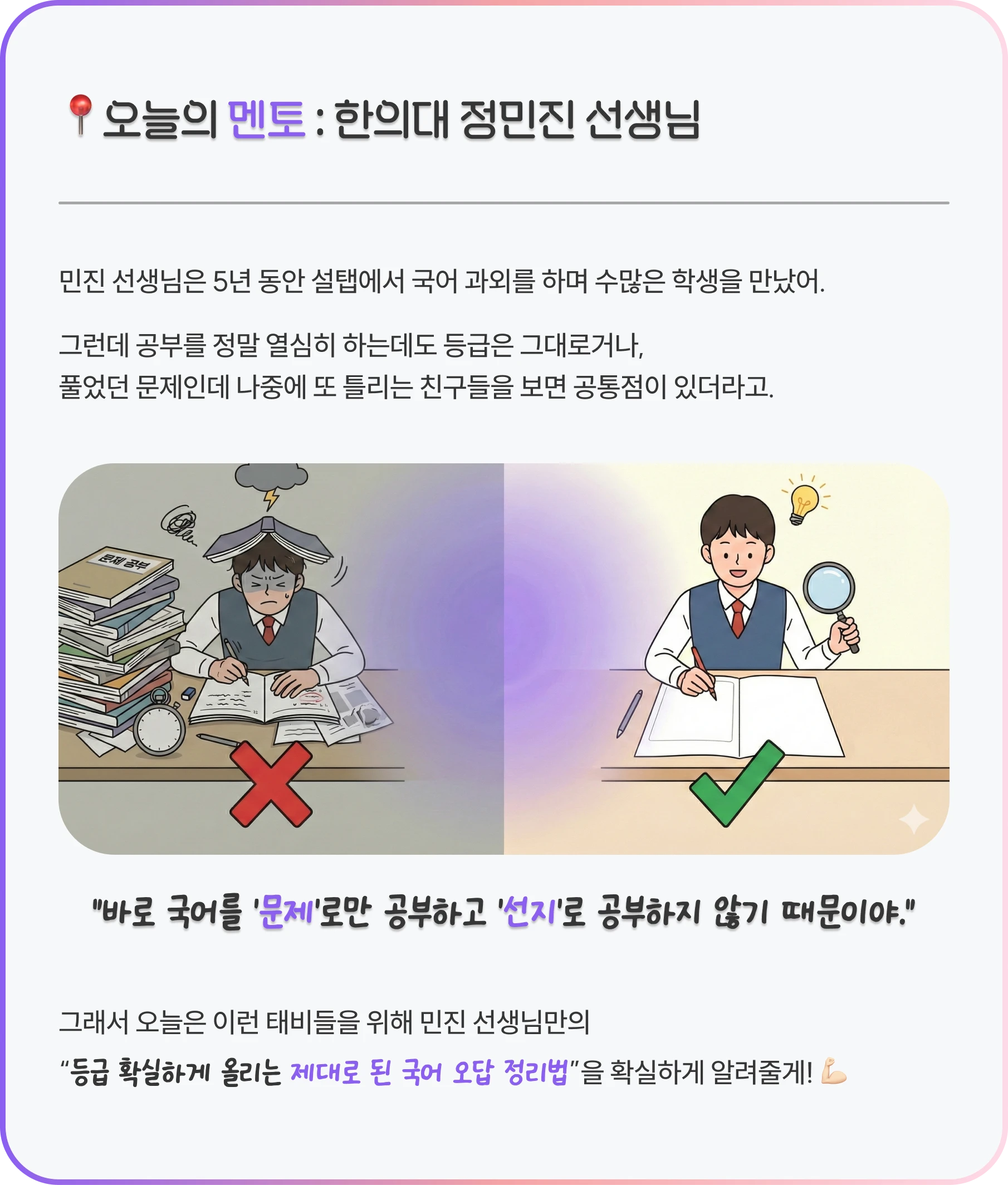 이제 완연한 가을이네! 선선해진 날씨를 맞이해서 그런지 우리집 앞에 있는 중학교에선 체육대회를 하는지 요 일주일이 시끌벅쩍하더라고. 다음주는 긴 추석 연휴가 있어. 공부만 하기엔 아쉽잖아? 그래서 우리가 흥미로운 콘텐츠 준비했지! '어른들은 모르는 우리들의 진짜 이야기, 설탭 19금토크!' 자퇴에 관해서 10대 크리에이터들과 어떤 이야기를 나눴을지 궁금하지 않아?! 고3, N수생을 위한 수능 D-100일 활용법 수능은 3년이라는 긴 여정의 마침표를 찍는 중요한 순간이야. 이 마지막 스퍼트 기간을 어떻게 보내느냐에 따라 결과는 크게 달라질 수 있어. 임해창 설탭 멘토쌤의 조언을 바탕으로 수능을 앞둔 수험생들이 꼭 챙겨야 할 네 가지 핵심 전략을 요약해왔어! 1. 오답 노트는 최고의 교재 수능이 다가올수록 새로운 문제 풀이에 집착하기보다, 그동안 틀렸던 문제들을 다시 보는 것이 훨씬 중요! 사람의 뇌는 정답을 찾는 자신만의 회로를 가지고 있어, 비슷한 유형의 문제를 반복해서 틀리는 경향이 있습니다. 따라서 오답 노트를 통해 왜 틀렸는지 그 이유를 분석하고, 올바른 풀이법을 반복 학습해야 합니다. 실수 원인 분석: 실수를 했다면, 왜 그랬는지 시간을 들여 깊게 고민하세요. 시간이 부족했는지, 문제를 잘못 읽었는지, 논리적 비약이 있었는지 등을 파악하고 해결책을 마련해야 합니다. 기출문제 활용: 만약 그동안의 모의고사 시험지를 버렸다면, 인터넷에서 기출문제를 다시 출력해서 풀어보세요. 특히 6월과 9월 모의고사는 수능 출제진이 다수 참여하므로, 새 문제지를 인쇄해 여러 번 풀어보는 것을 강력히 추천합니다. 2. 과목별 균형 잡기 특정 과목에만 집중하는 것은 위험! 9월 모의고사에서 약점을 파악했다 하더라도, 강한 과목을 소홀히 하면 수능 당일 예상치 못한 실수가 발생할 수 있습니다. 예를 들어, 수학이 약점이라 수학만 공부하면, 국어 실력이 떨어져 전체 성적은 결국 제자리걸음일 수 있습니다. 약점 보완 + 강점 유지: 남은 기간 동안 약점을 보완하는 데 시간을 더 할애하되, 다른 과목들도 꾸준히 투자해야 합니다. 이는 수능 당일 모든 과목에서 최상의 컨디션을 유지하는 데 필수적입니다. 3. 실전처럼 준비하기 수능 당일의 긴장감은 실력 발휘를 방해하는 가장 큰 적! 이를 극복하기 위해선 평소에 수능과 비슷한 환경에서 공부하는 연습이 필요합니다. 생체리듬 조절: 수능 시험 시간표에 맞춰 일찍 자고 일찍 일어나는 습관을 들이세요. 몸이 긴장하면 낮잠을 자기도 어렵기 때문에, 시험 시간 내내 집중력을 유지할 수 있도록 생체리듬을 맞춰야 합니다. 환경 적응: 교실 책상을 수능처럼 한 칸씩 띄어 배치하고, 보온병을 사용하는 등 실제 시험장 환경에 익숙해지도록 연습하세요. 책상과 의자의 상태에 너무 신경 쓰지 않는 것도 중요합니다. 집중력 훈련: 자습 시간에 모의고사를 풀 때도 실제 시험처럼 쉬지 않고 집중해서 푸는 연습을 해야 합니다. 그래야 수능 당일 갑작스럽게 늘어난 집중 시간을 감당할 수 있습니다. 4. 수면 습관 조절하기 수능 날 최상의 컨디션을 위해선 충분한 수면 시간을 확보하는 것이 매우 중요! 늦게 자고 늦게 일어나는 습관은 수능 준비에 독이 될 수 있습니다. 수면 패턴 변경: 시험은 오전에 시작해 오후까지 이어집니다. 따라서 지금부터 서서히 밤 11시에서 12시 사이에 잠들 수 있도록 수면 패턴을 조절해야 합니다. 한꺼번에 바꾸기보다는 조금씩 당겨가며 몸에 무리를 주지 않는 것이 좋습니다.