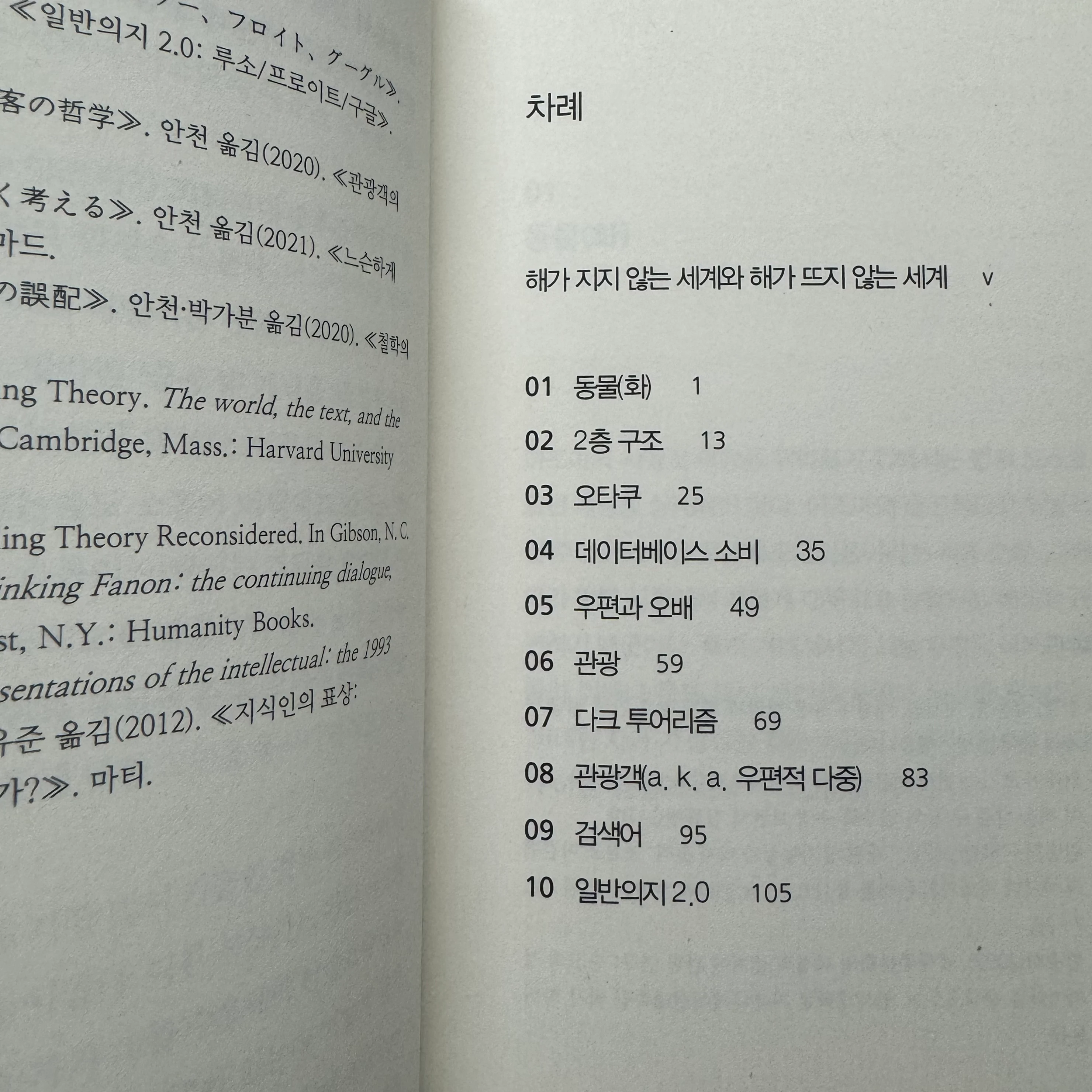 ... 아즈마의 모든 작업은 현실을 부인하거나 외면하는 대신 마땅히 인정하는 데서 출발한다. 비평이 "어떤 특정 작품이나 특정 사건을 문화적, 사회적으로 의미 있는 대상처럼 각색하는 것, 다시 말해 특수성이 전체성과 관계 있는 듯한 환상을 제공하는 것"이고, 철학이 여기에 무한한 자원을 제공하는 '사유의 보고'라면, 양자가 사적 이해를 위한 도구로 쓰이거나 온라인 쇼핑몰에 게시된 상품 이미지처럼 존재한다고 한들 문제될 것은 전혀 없다.
